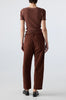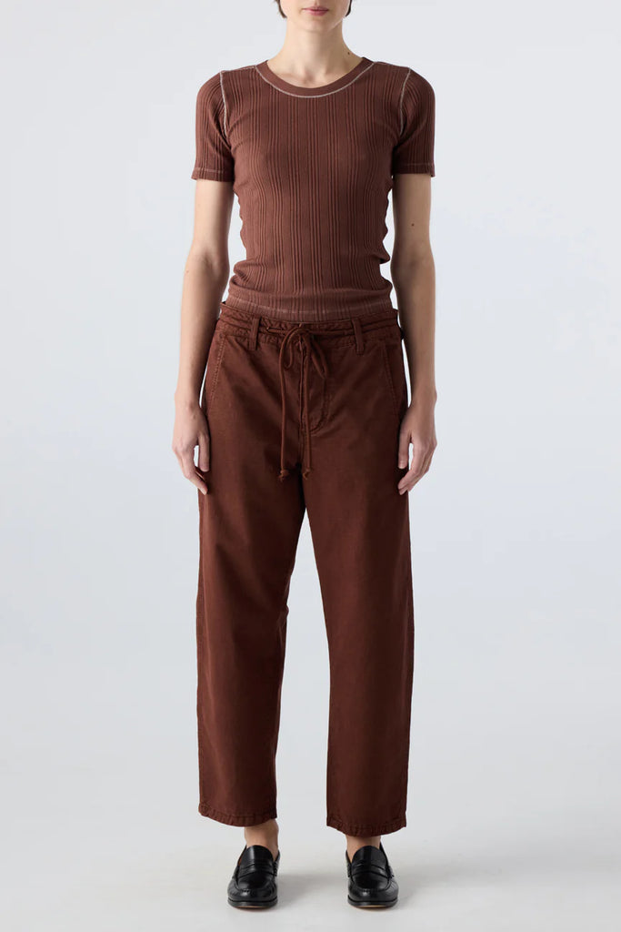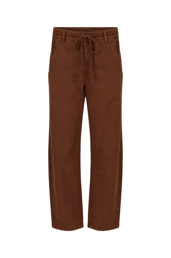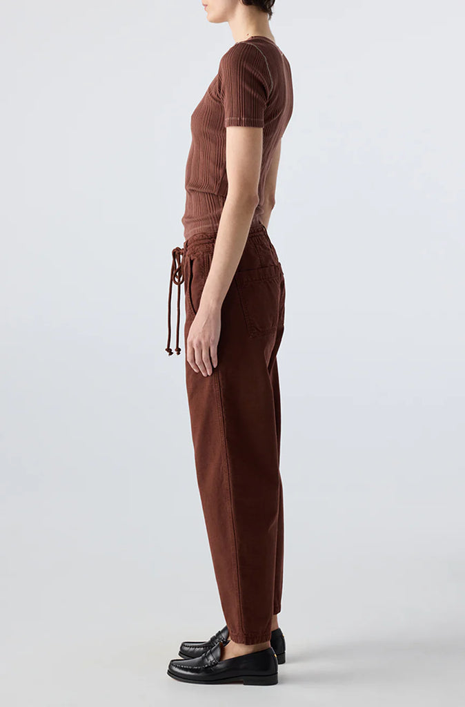 AMO coco brown cotton lyocell Elaine trouser pant. Sitting just below the waist with a dropped rise, this trouser features a subtle barrel shape. Finished with trouser-style pockets, a tailored hem, and a drawstring waist for a perfectly cinched fit.