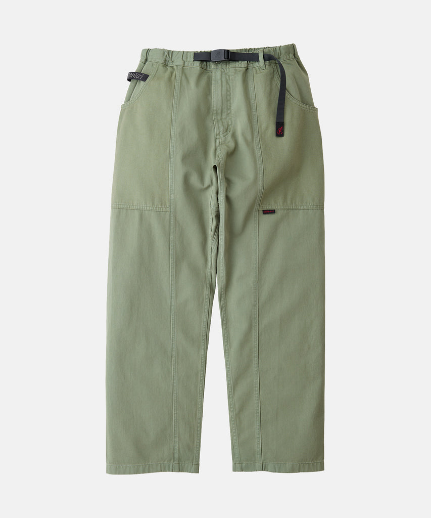 Gramicci sage green 100% organic cotton twill fabric Gadget pant. Slim fit, low rise, zip fly, easy adjust waistband with integrated belt, gusseted crotch for excellent movement, wrap around pockets with a shorter hemline. D-ring with brand logo on the right side to hold keys and bottles. Garment washed for a vintage feel and look. Imported