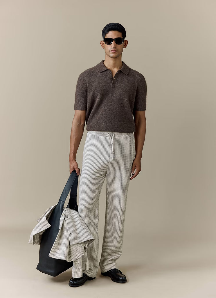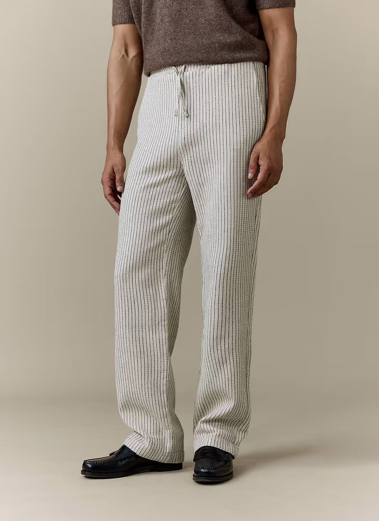 Percival ecru striped Sorrento wide leg cotton linen trousers. Made from an easy breezy linen blend, that drapes, relaxed but straight leg fit trousers, elasticated waist with drawcord. Perfect for a casual summers day, a holiday suit or wear as a co-ord.