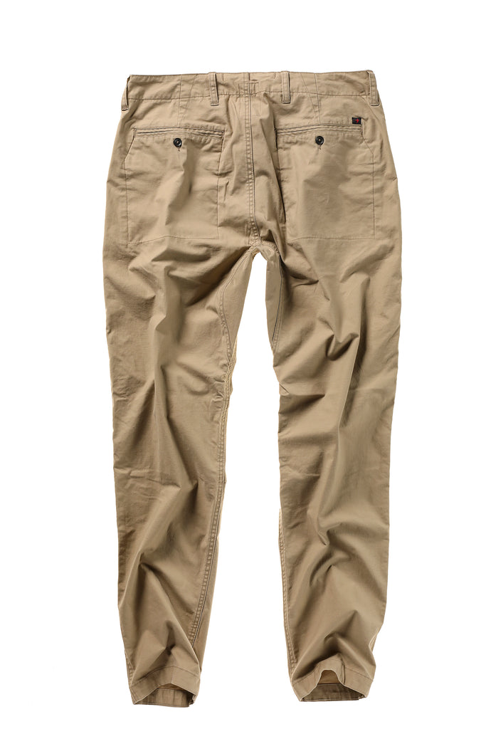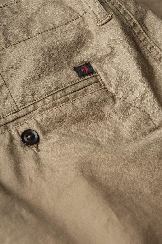 Relwen british khaki duraflex chino is a classic flat front chino made of a 97% cotton, 3% spandex, broken twill fabric. 250 GSM fabric weight. Interior pocketing and facing is 100% cotton 2x1 natural twill.