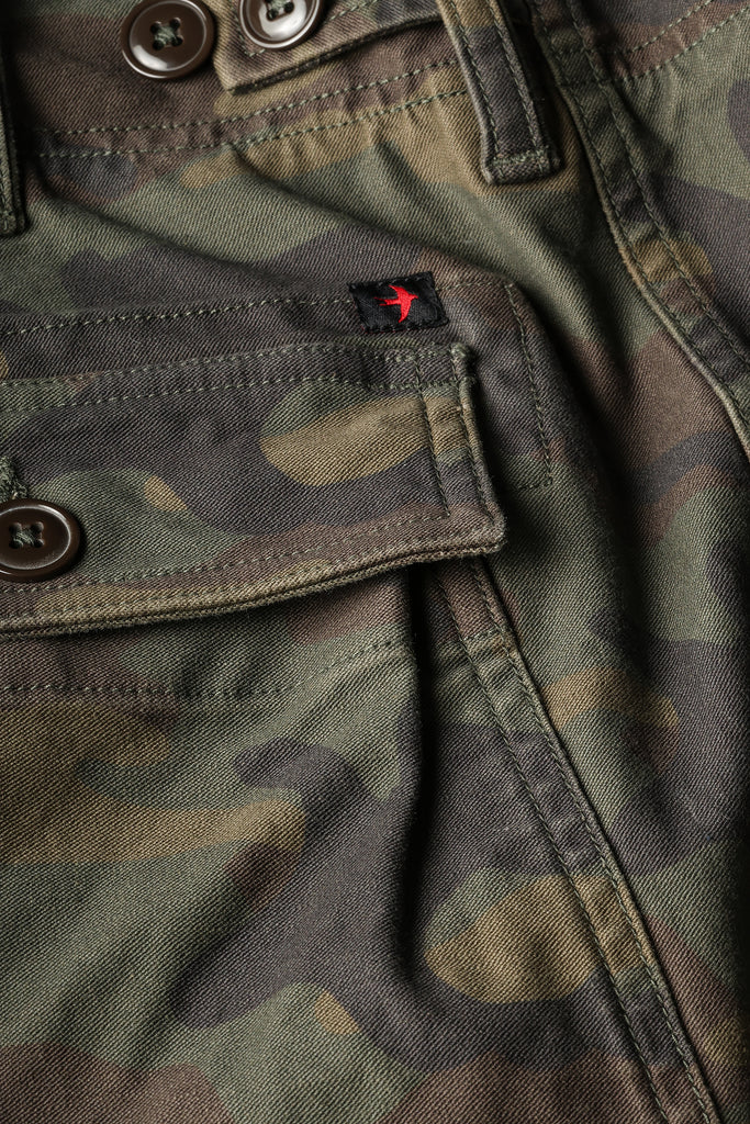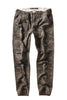 Relwen's dark camo cotton limited supply pant. Fabric is 97% cotton, 3% spandex, peached reverse broken twill, 300gsm. Inspired U.S. military utility pant constructed rugged 4 ply felled seams through out. Featured seamless hollywood waistband  with adjustable button tabs at back waistband.
