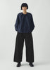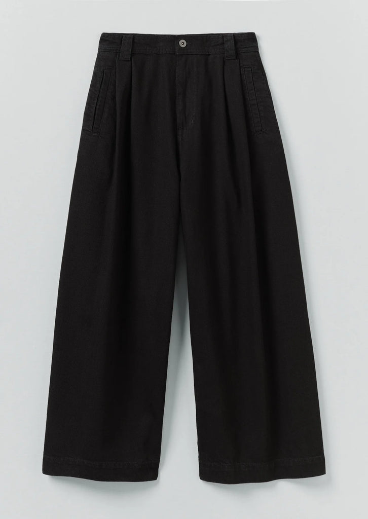 Toast Womens Carbon Black Denim Pleat Front Pants made from a blend of regenerative and 100% recycled cotton. Knife pleats. Back darts. Ankle-length legs. Welt pockets. Twin topstitching.