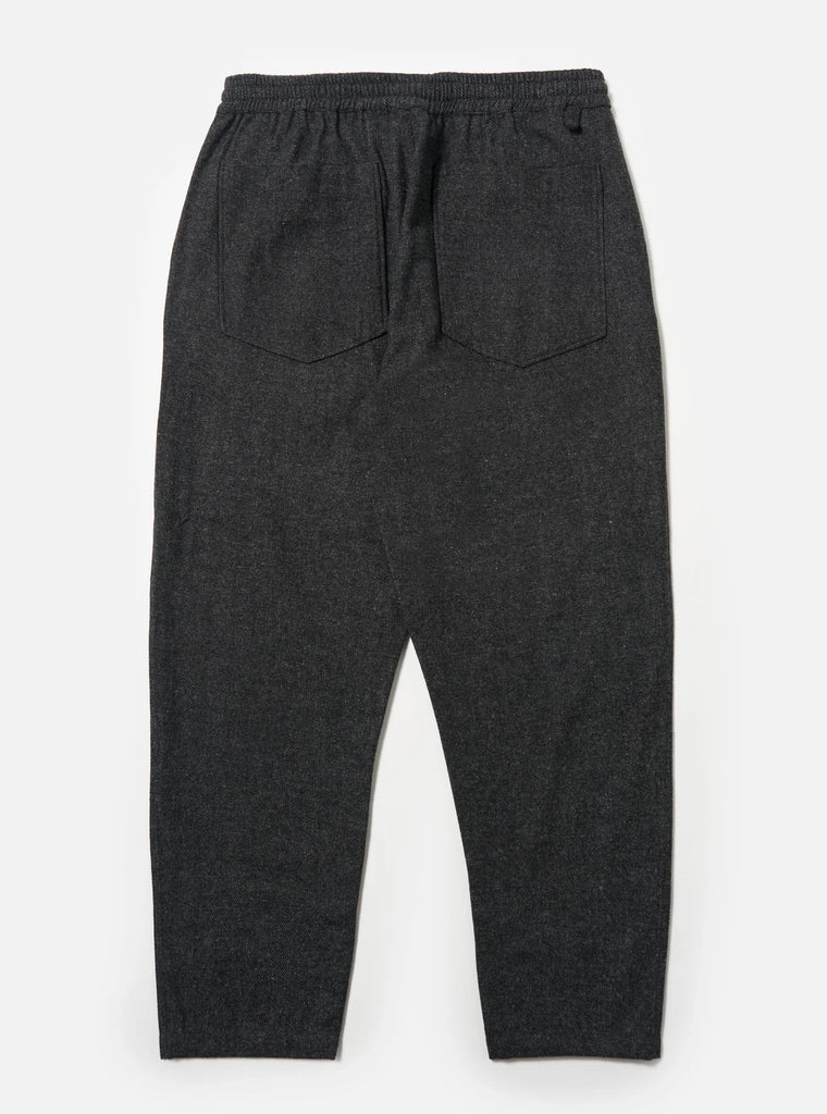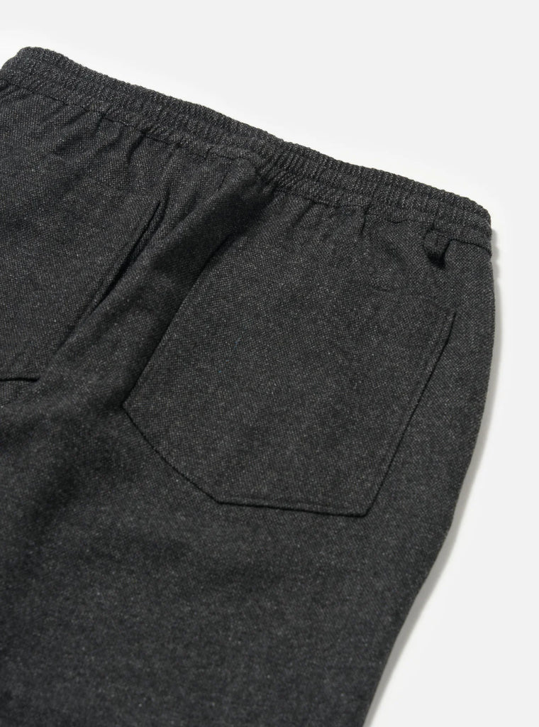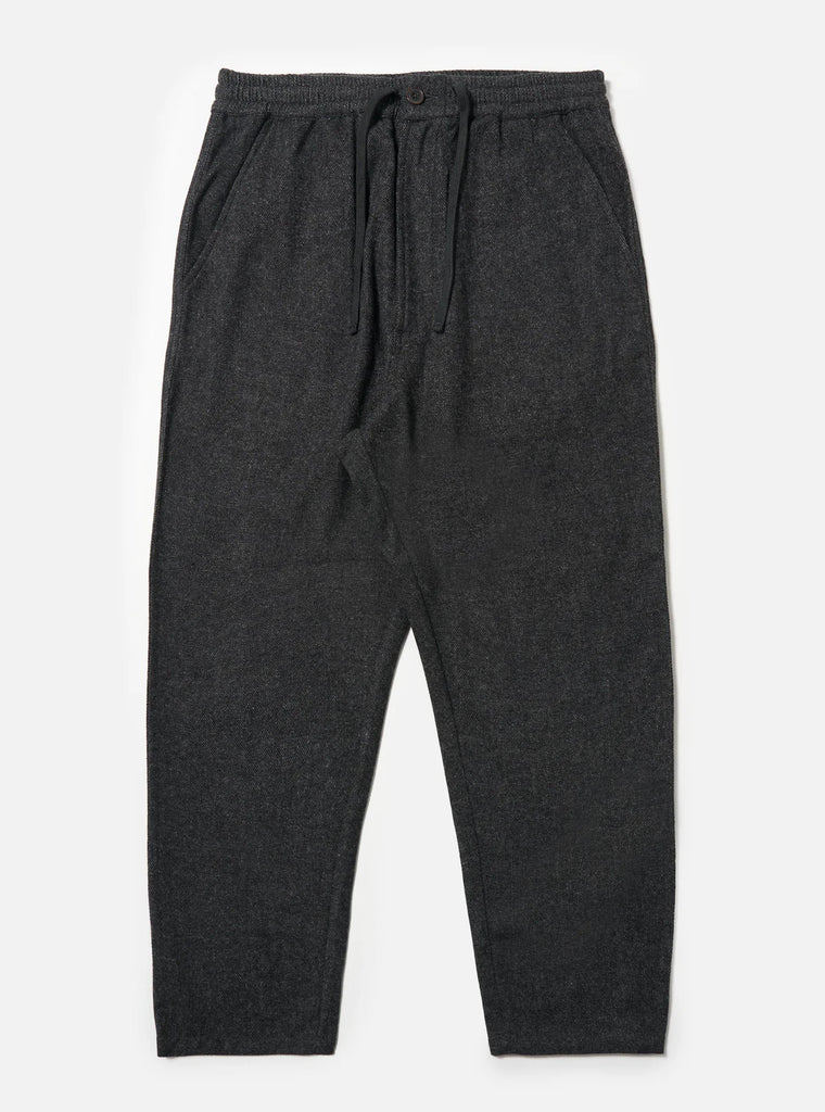 Universal Works grey up cycled wool blend Hi Water trouser pant. A slightly cropped trouser, designed to sit above the ankle. A casual fit but neat around the hips, two slanted hand pockets, two rear back patch pockets and a drawstring waist.