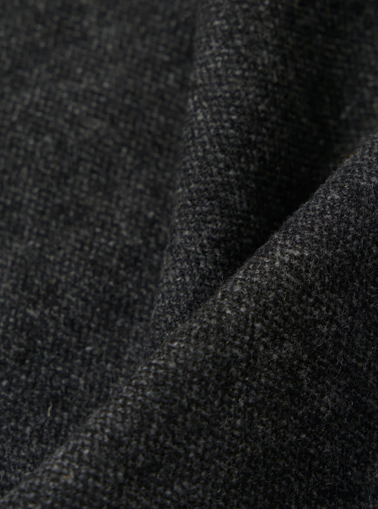 Fabric is a medium-weight suiting using a mix of upcycled, tonal fibres in a birdseye weave, which creates a grey that is full of character and texture.