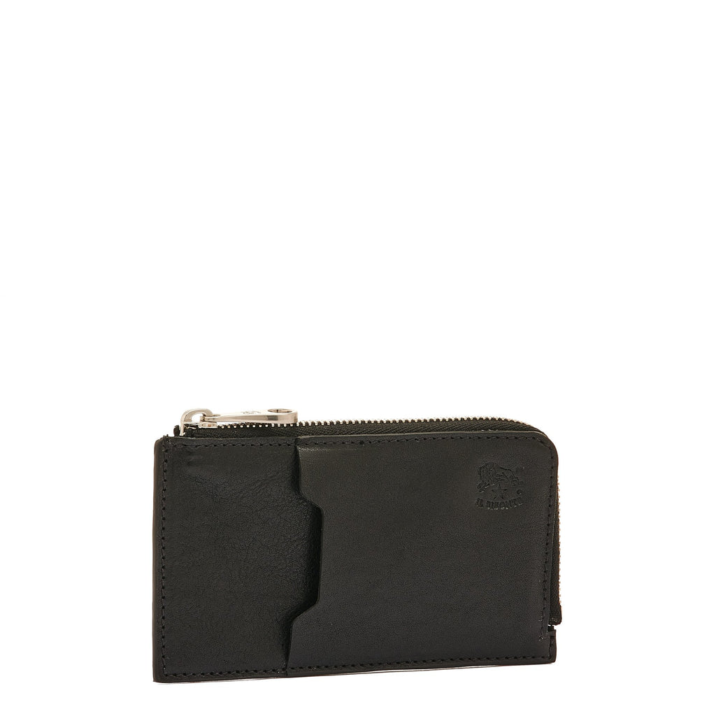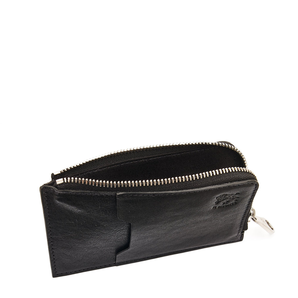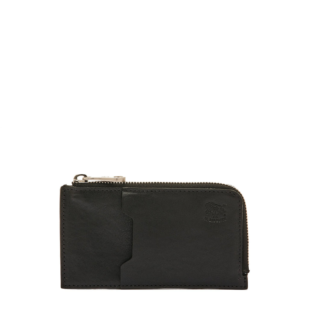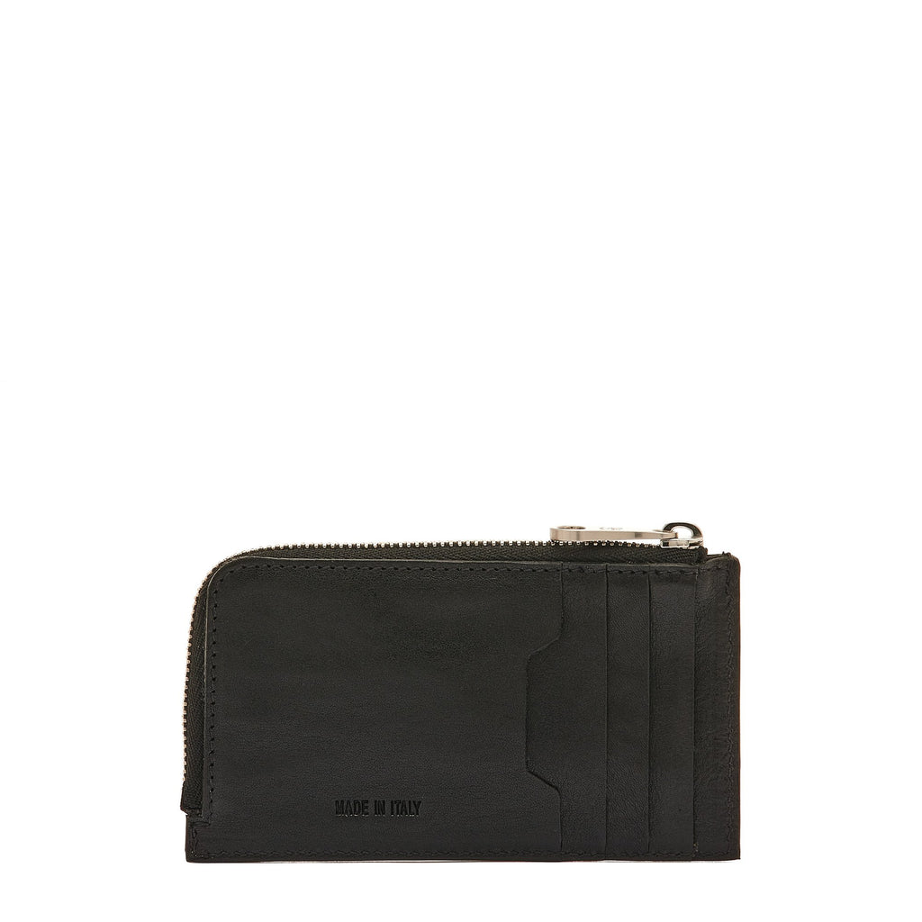 Il Bisonte's black vegetable-tanned leather Duccio zip wallet. Five external card slots with an iconic geometric profile. Cotton canvas lining with a compartment for bills and coins. Zip closure. 100% made in Italy