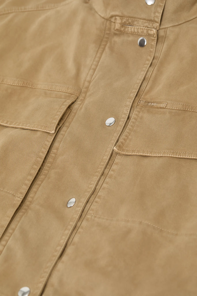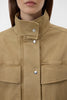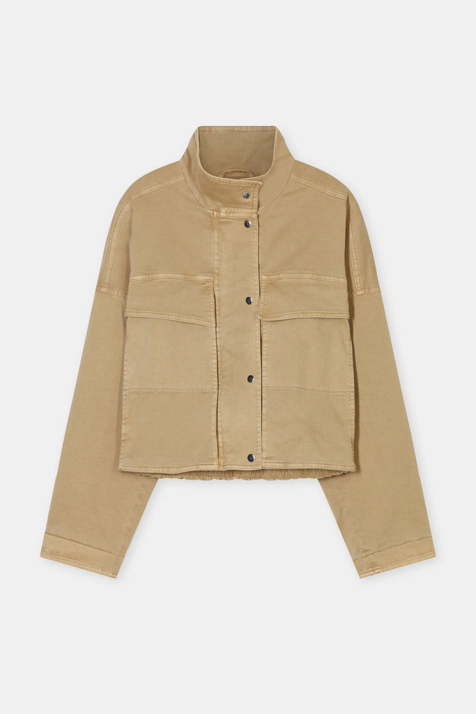 Closed Women's Urban Beige Signature Jacket. This cropped jacket has a dual closure, utilizing a zipper with five snap buttons including one on the collar. Additionally, there are functional snap buttons on the sleeve cuffs to widen or narrow the fit around the wrist. The fabric make-up is 97% cotton and 3% elastane.