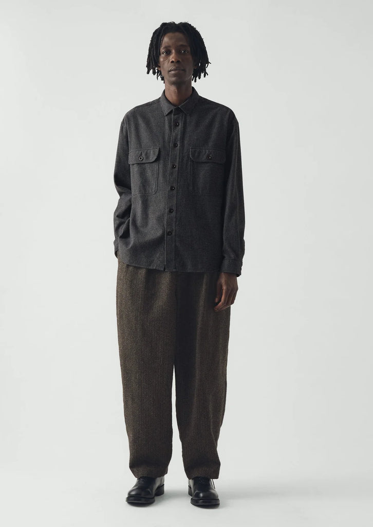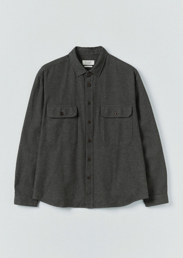 Toast Charcoal Grey Brushed Workwear Shirt, made from cotton woven in a houndstooth construction. Cut to a relaxed shape with a curved hem. Flap pockets cut on the bias angle the houndstooth pattern in a contrasting direction. Finished with corozo buttons.