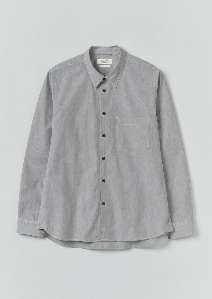 Toast ecrus slate fine striped button down shirt. A fine stripe adds texture to this shirt. Made from cotton with a point collar, corozo buttons, patch chest pocket and subtle pleats at the back yoke. Regular fit.
