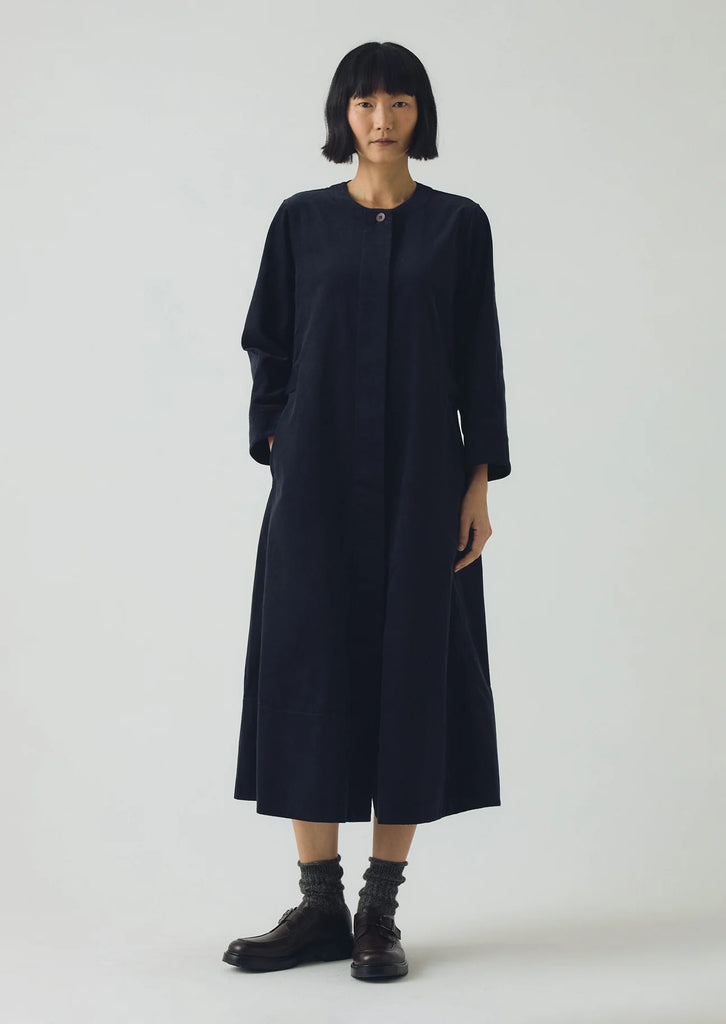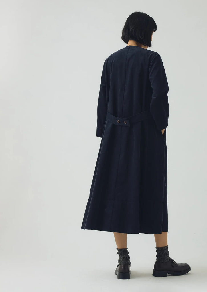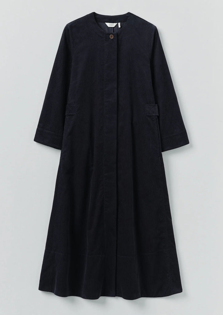 Toast Womens Midnight Blue Adjustable A Line Dress, made from 100% organic cotton cord with an adjustable buttoned tab at the back. Secured with a concealed placket, revealing the top button. The A-line dress draws volume through the skirt, finished with sleeves that can be turned up. Made in China.