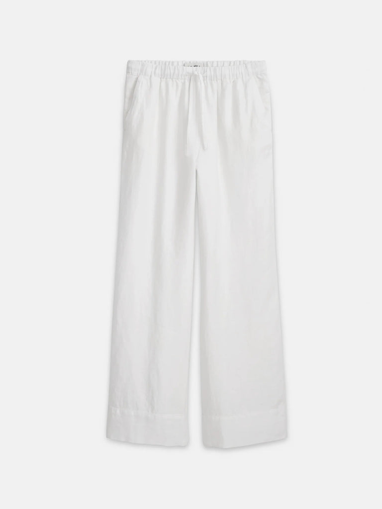 Alex Mill white linen Riley pant.  A comfortable, pull-on, elastic adjustable waist pant with french seams construction. Fits true to size.