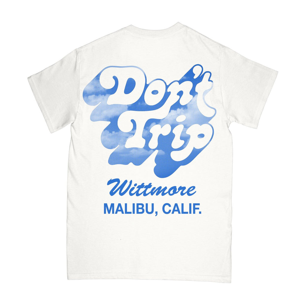 EXCLUSIVE! Free and Easy Don't Trip Malibu drop shadow tee in a coconut color tee with blue sky print drop shadow graphic and blue ink. 100% cotton. Don't Trip logo on back. Free & Easy logo on chest. Made with hand-screened graphics in Los Angeles.