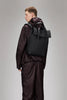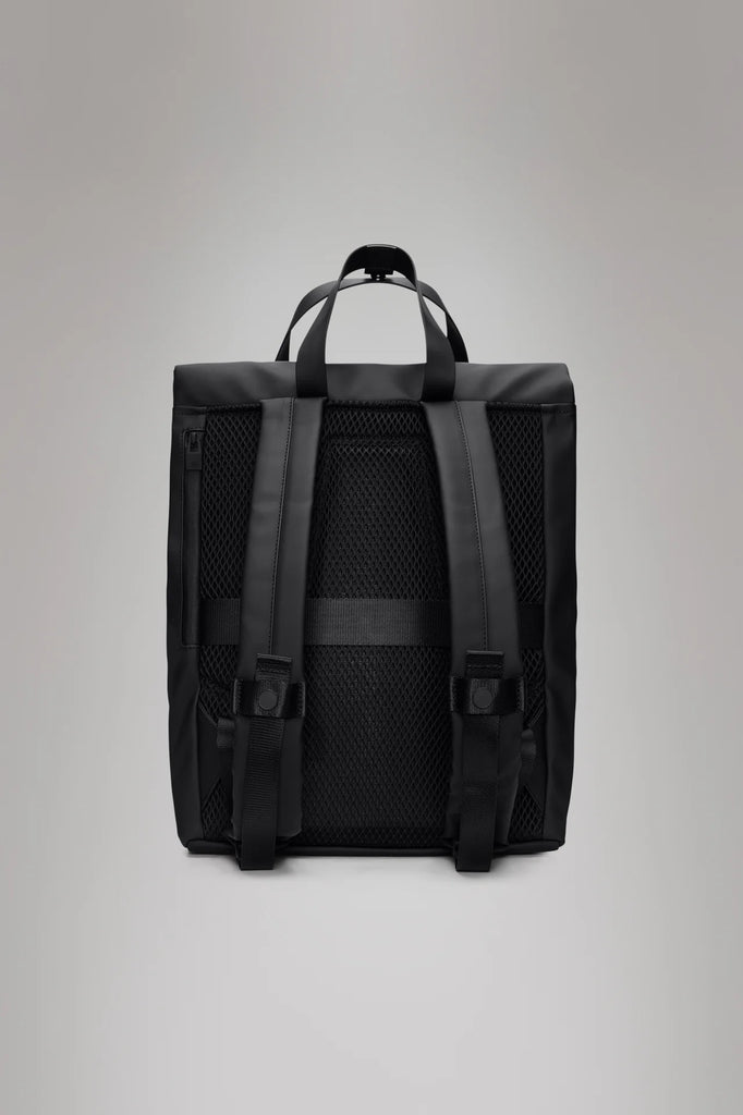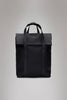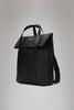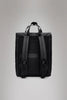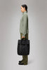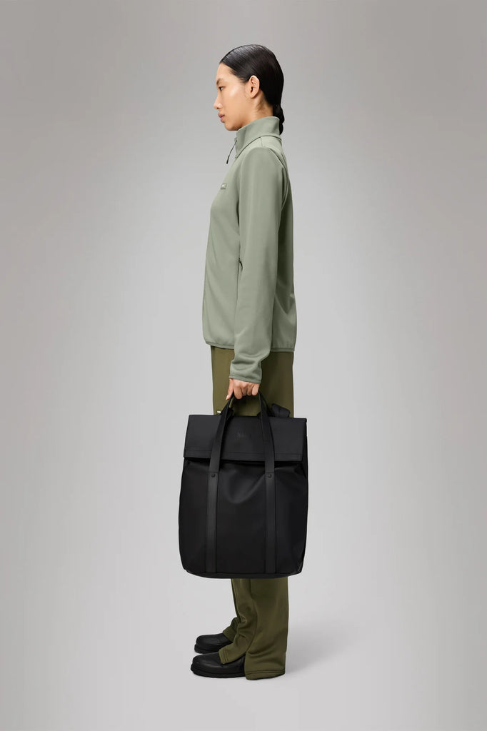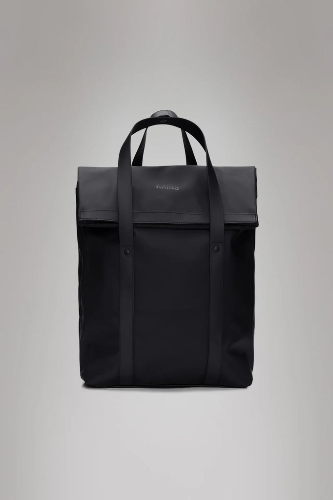 Rains black 2 way tote backpack is characterized by a fold-top opening and signature TPU strap details with top handles. The fold-top opening gives full access to a spacious main compartment with multiple slip and zip pockets and a padded pocket that fits a 16” laptop. On the backside you find a pocket with quick entry for smaller essentials like keys and phone. Trolley slip strap in webbing.