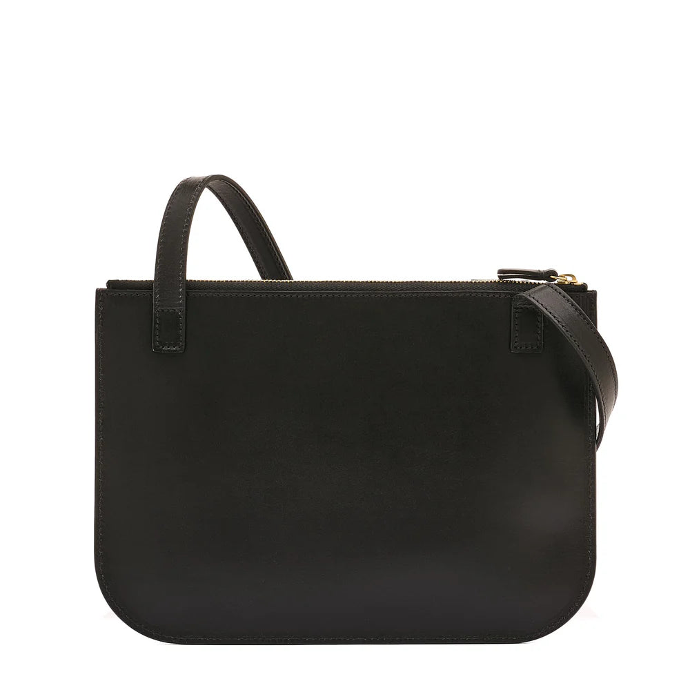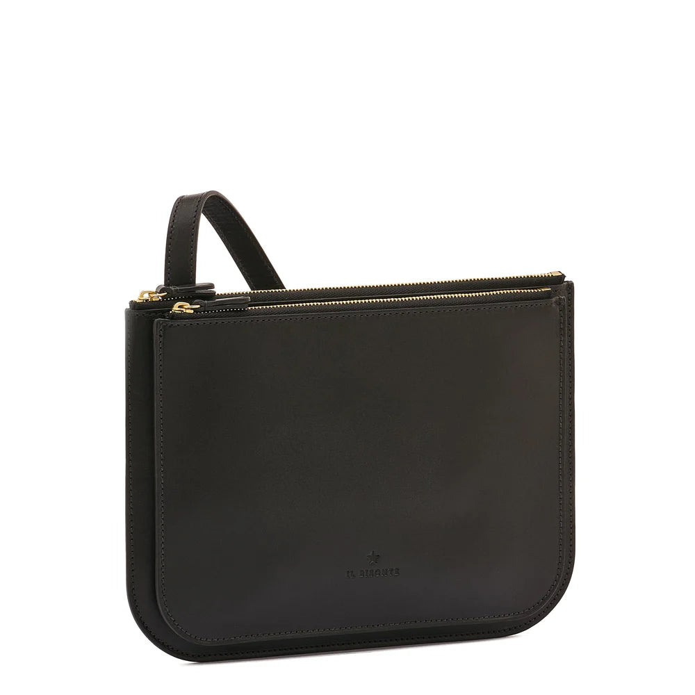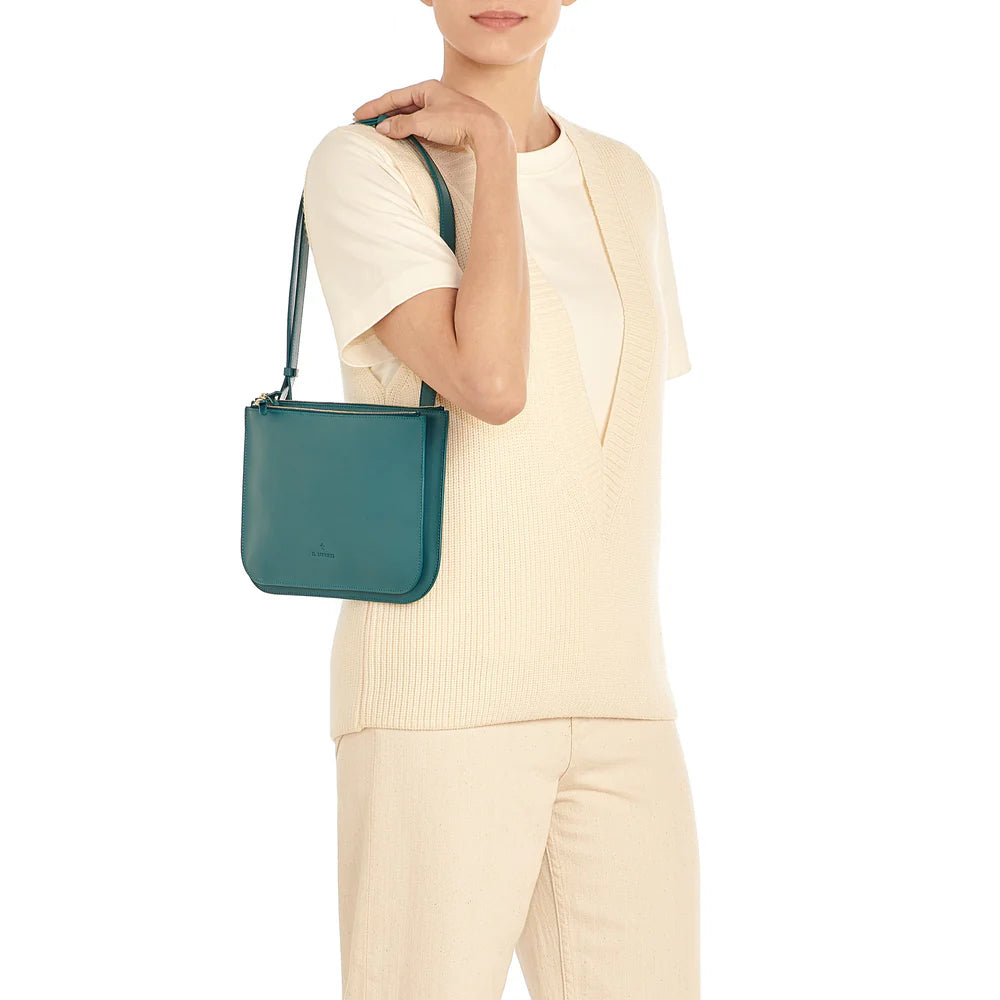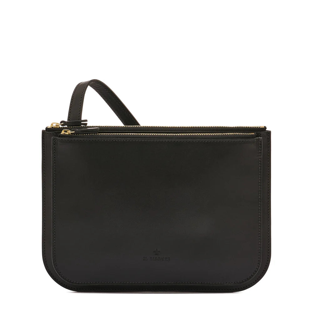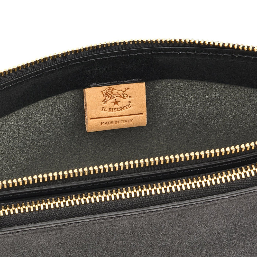 Il Bisonte's Roseto crossbody made of smooth vegetable-tanned leather. The shoulder strap can be adjusted with a brass stud. The two unlined zippered compartments have leather pulls. One open center compartment. 100% made in Italy.