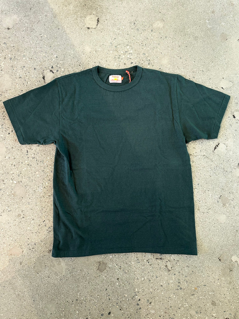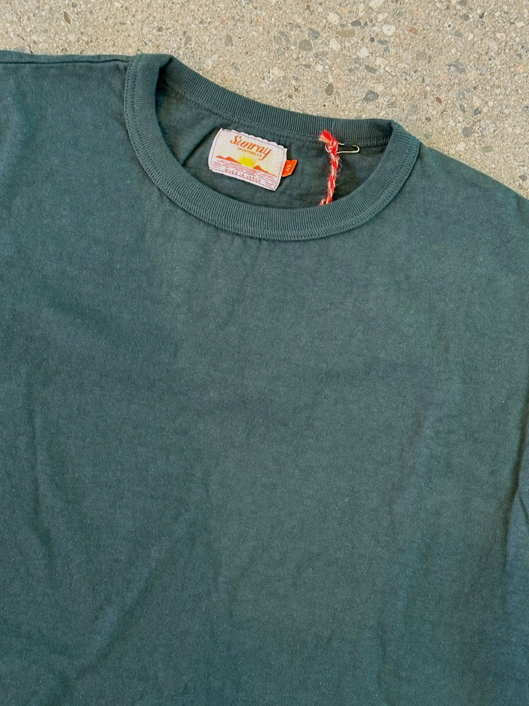 Sunray Haleiwa tee in dark spruce. Recycled heavyweight cotton. Traditional 1950's fit, slightly boxy, slightly more generous short sleeve. Tube tee with no side seams. Fits true to size. All packaging and tags from recycled materials.