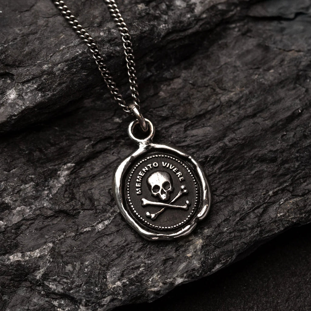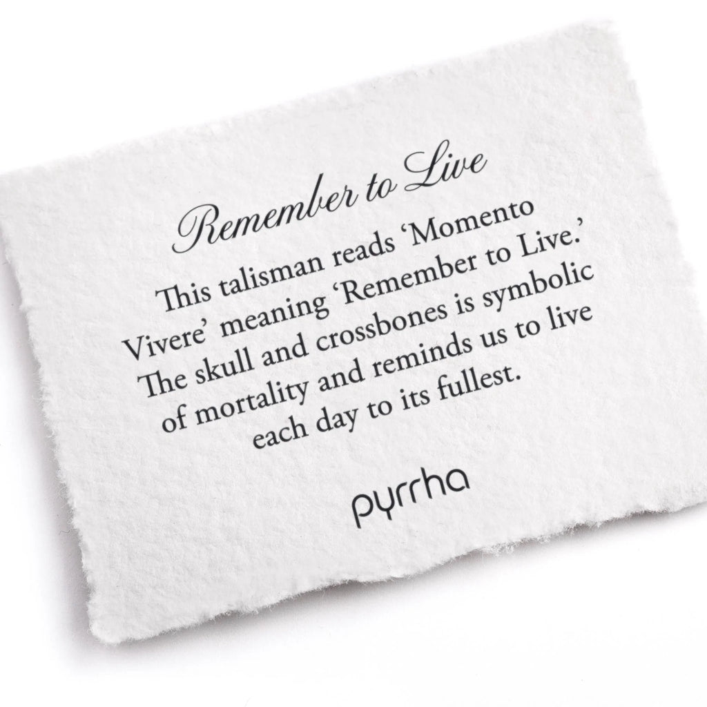‘Momento Vivere’ meaning ‘Remember to Live.’ The skull and crossbones is symbolic of mortality and reminds us to live each day to its fullest.