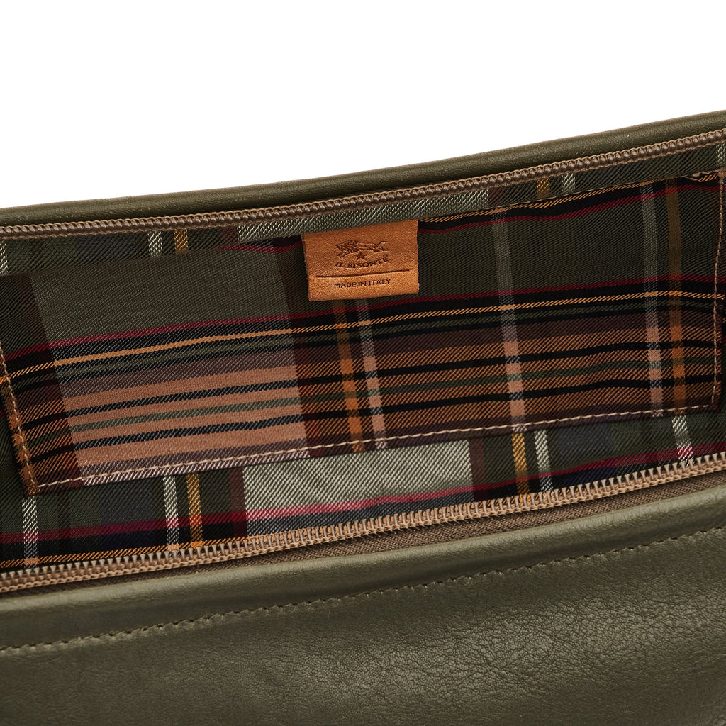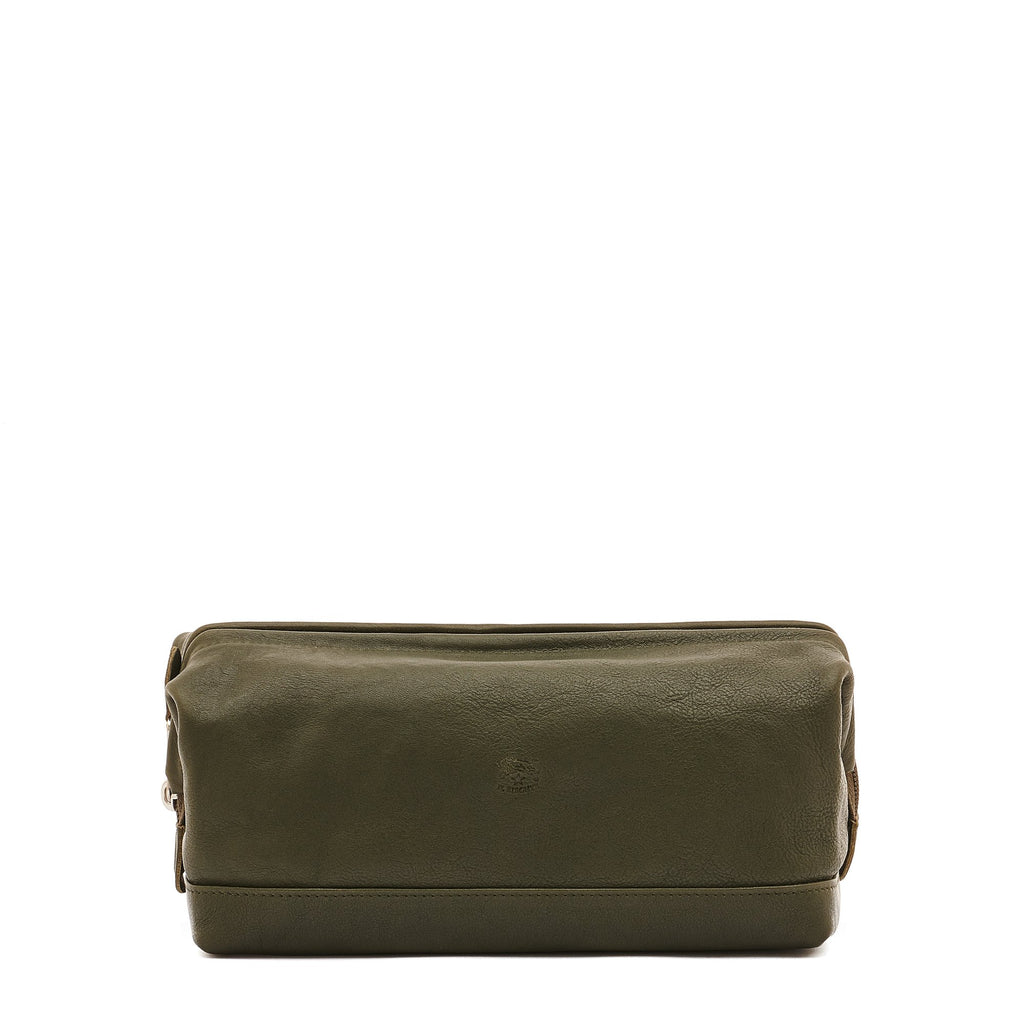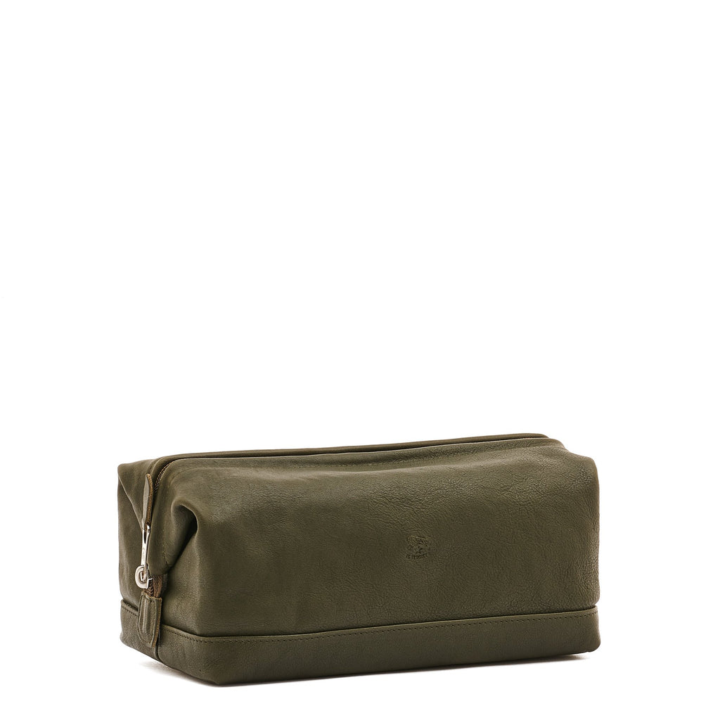 Il Bisonte's bosco green leather dopp kit travel case. Store your bathroom essentials for when you travel.  Dimensions 9.84" W x 5.5" H