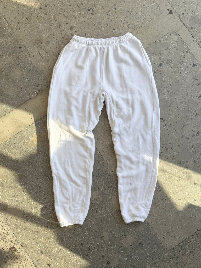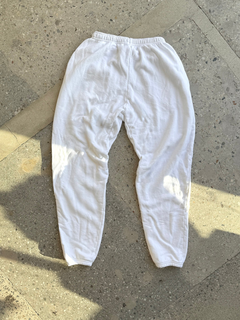 Velva Sheen 8 oz midweight new gym sweatpants in pigment dyed in white. 100% french terry cotton with a soft french terry looped interior for softness. Drawstring elastic waist, side pockets,  no back pocket and gusted crotch for movement.
