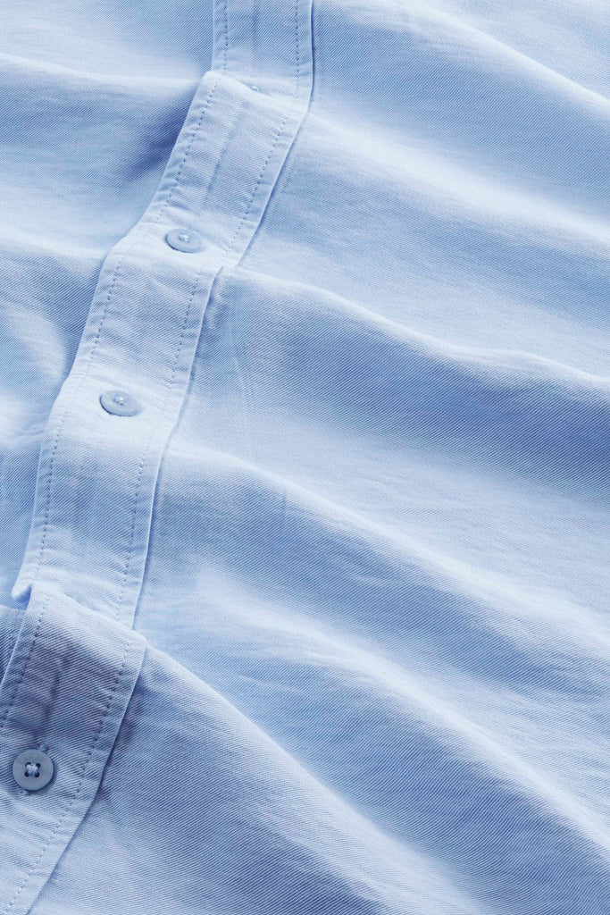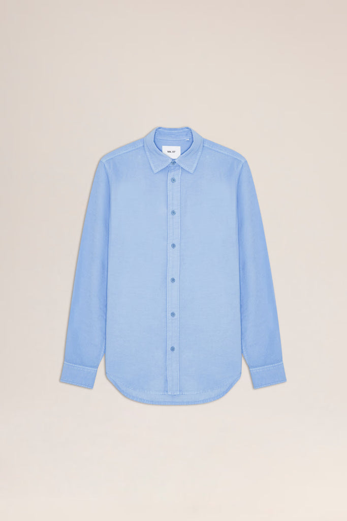 NN.07 cerulean blue viscose blend Colby long sleeve button down shirt. Fly away collar, wide placket, branded buttons, twin needle stitching for clean construction.  Soft hand feel drapey fabric whuch is LENZING™ ECOVERO™ viscose. 194 g/m²