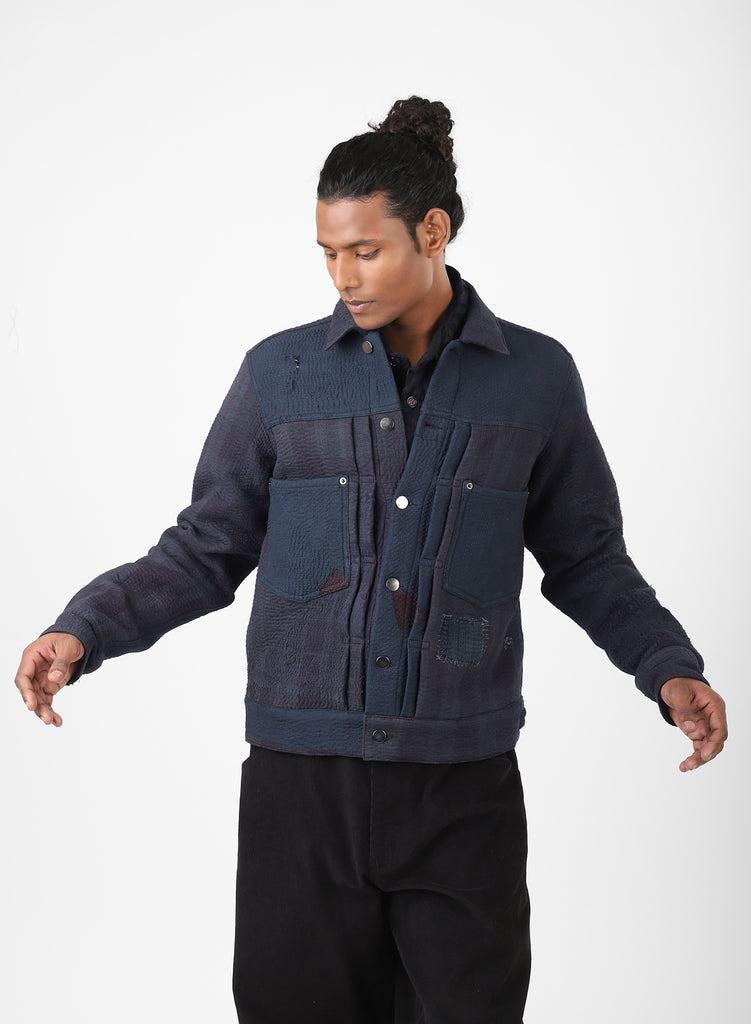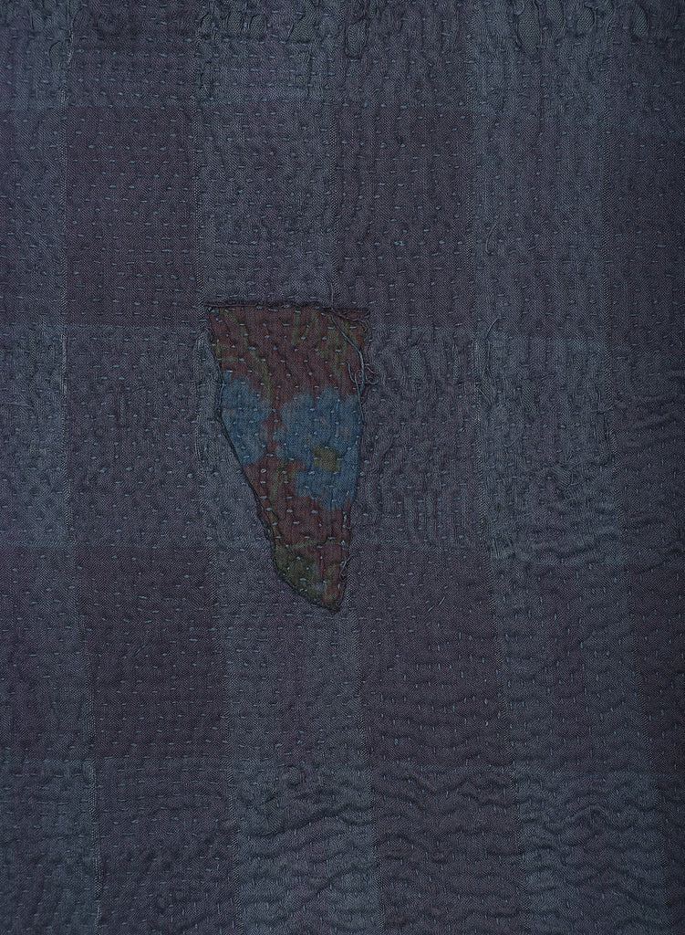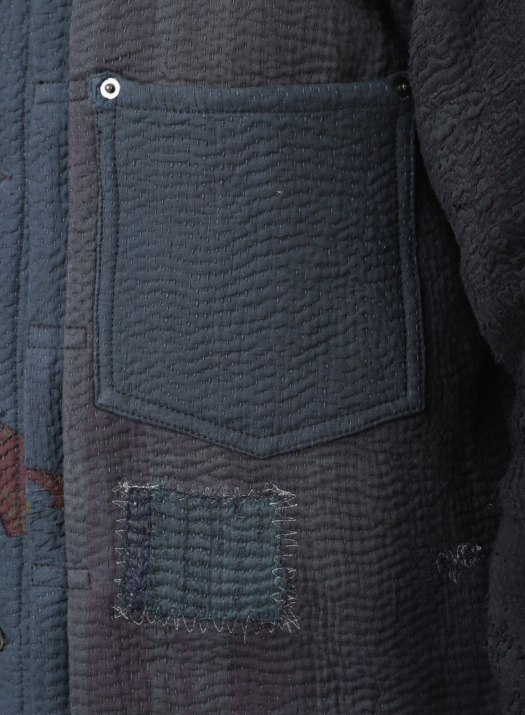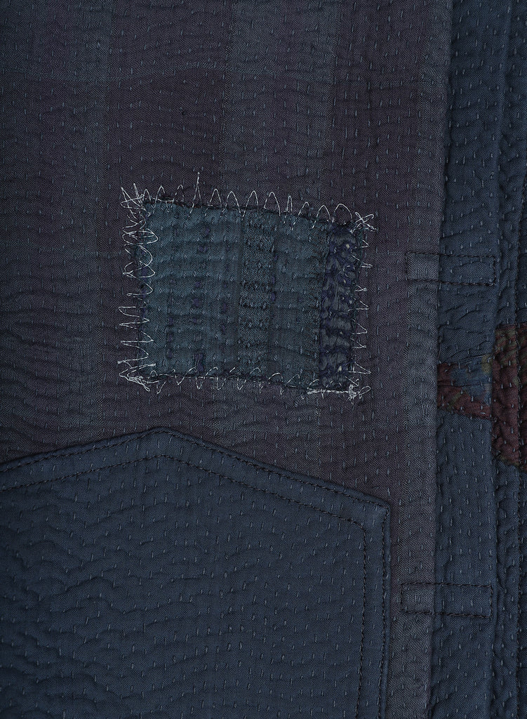 Kardo works kantha blankets made from old saris, layered and held together by the running stitch — a tradition that began in Bengal and spread across India. Softened by time, these quilts are reworked into garments where the aged tones, irregular patches, and hand-sewn seams become part of the design. Each piece carries the history of the cloth it once was while taking on a new form that keeps the kantha work in view.