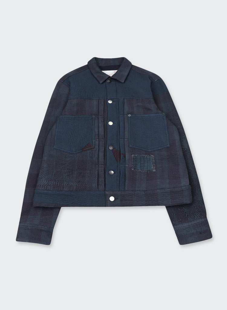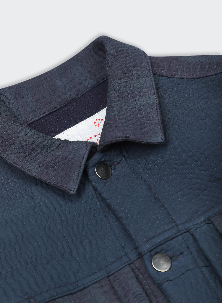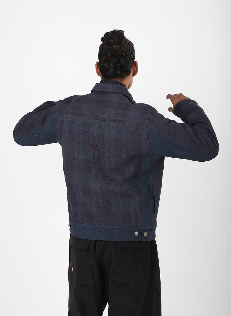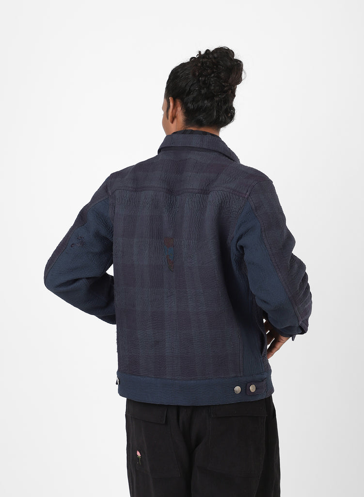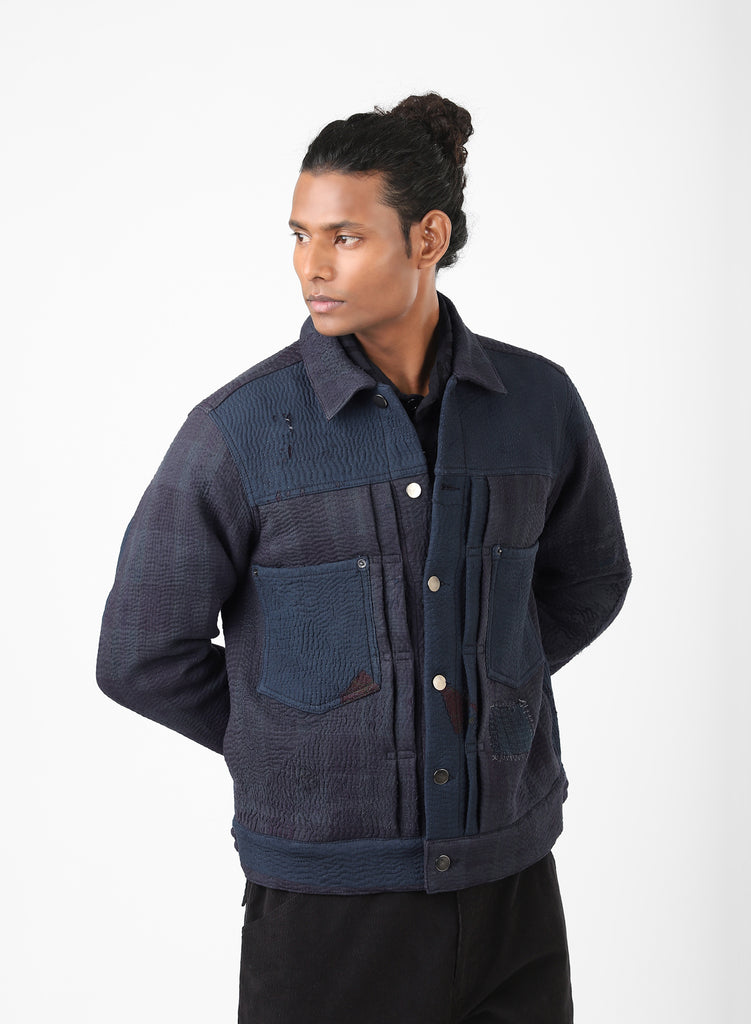 Kardo works kantha blankets made from old saris, layered and held together by the running stitch — a tradition that began in Bengal and spread across India. Softened by time, these quilts are reworked into garments where the aged tones, irregular patches, and hand-sewn seams become part of the design. Each piece carries the history of the cloth it once was while taking on a new form that keeps the kantha work in view.