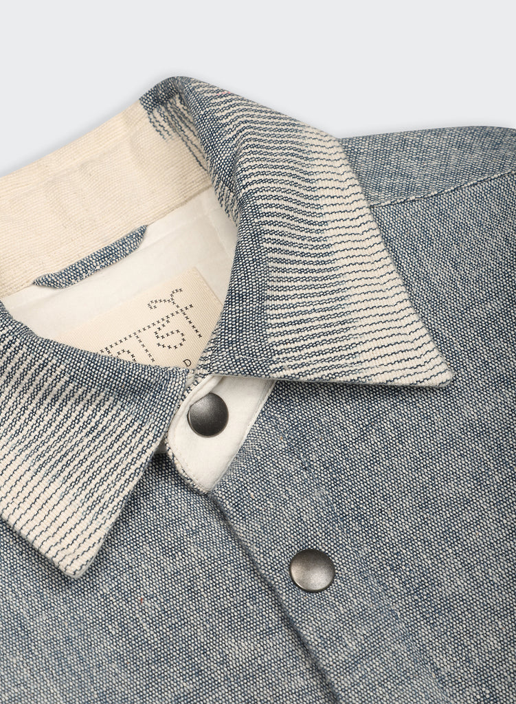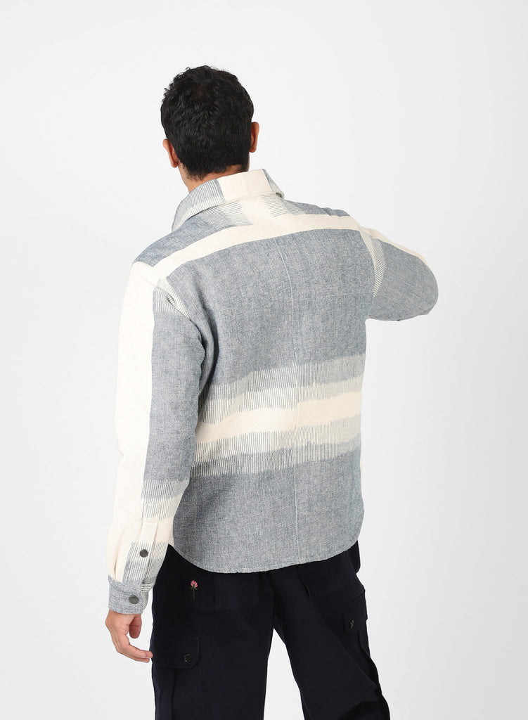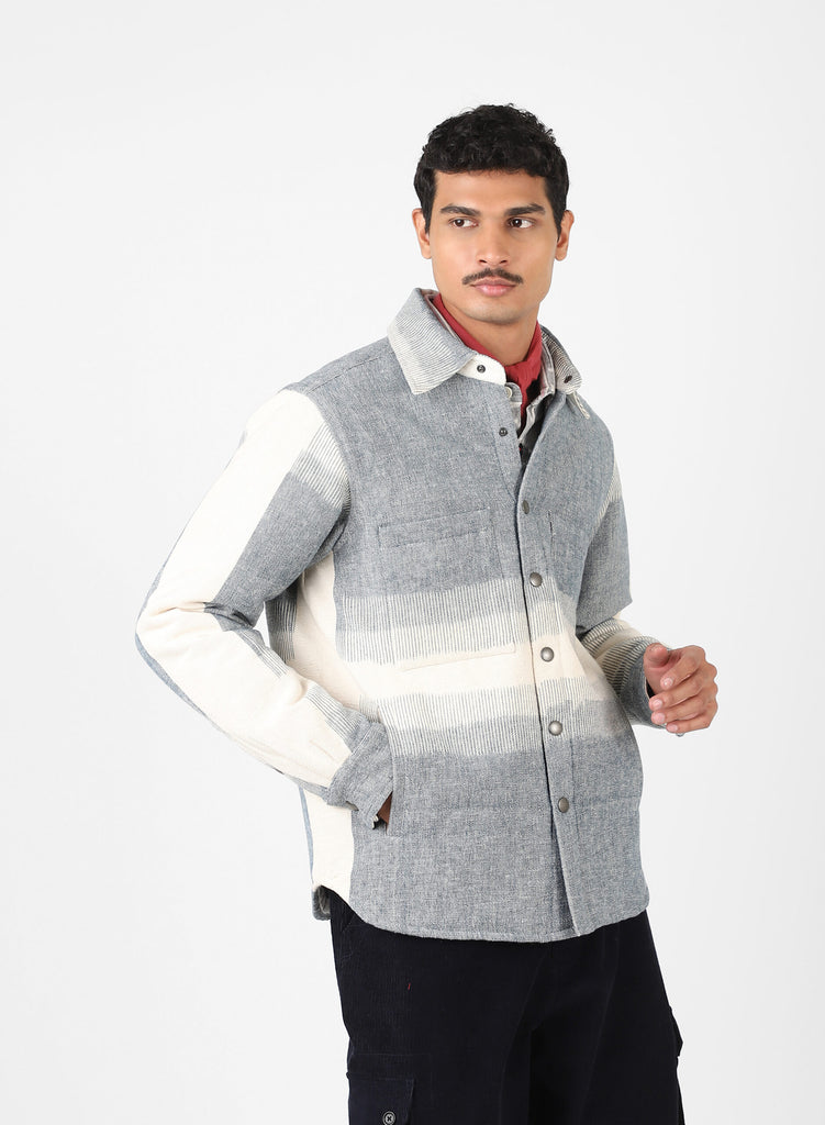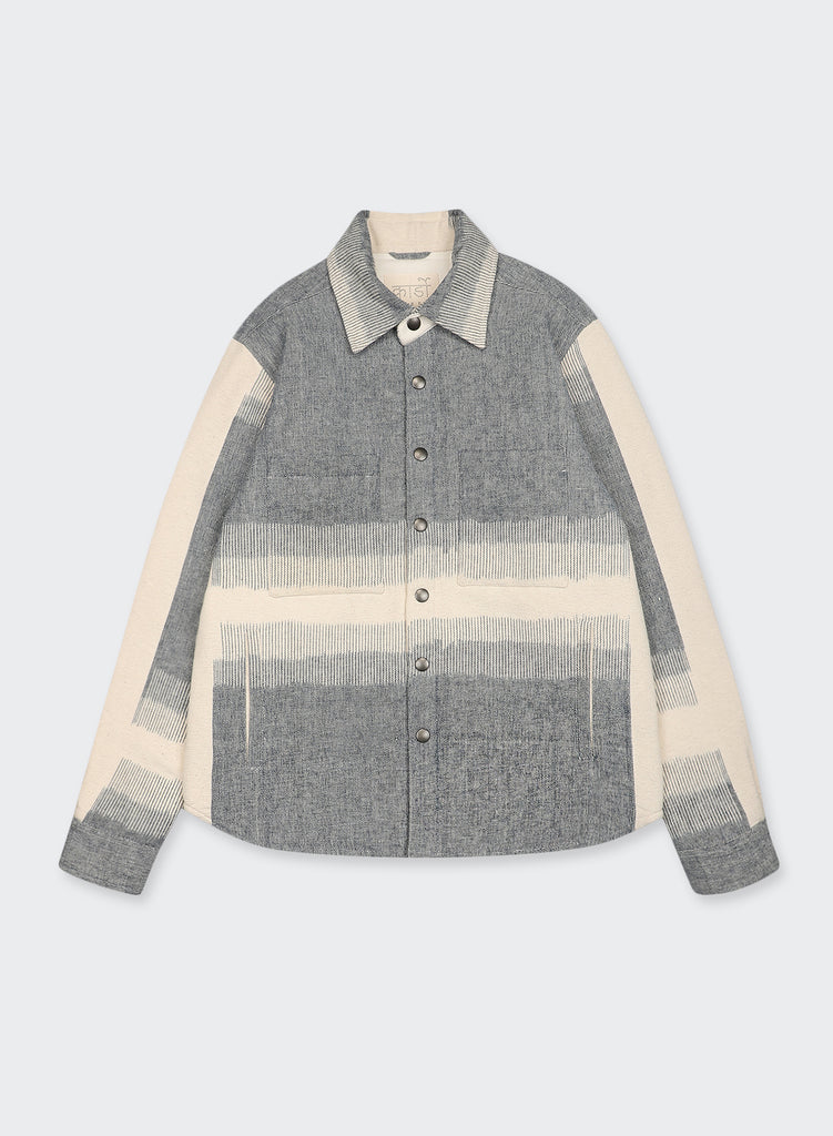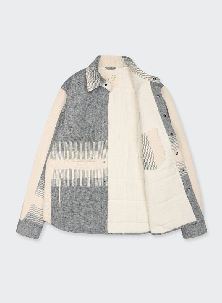 The Kardo grey ikat jacquard quilted woody shirt jacket. Snap closure, patch chest pockets, side pockets with embroidered flower in front corner.