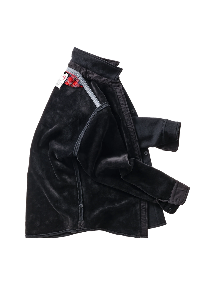 Relwen's bonded fleece pique work shirt. 70% cotton, 30% poly pique face with soft-brushed 100% poly velour bonded backside, 460 gsm over-shirt weight. Woven cotton sheeting facings at collar band, top collar, center placket, sleeve binding, cuffs, and flap chest pockets for reduced thickness and holding shape. Red plaid flannel half-moon at interior center back along neck seam. Polyester knit tape reinforced back neck and shoulder seams. Wear as a shirt or overshirt layered.