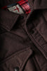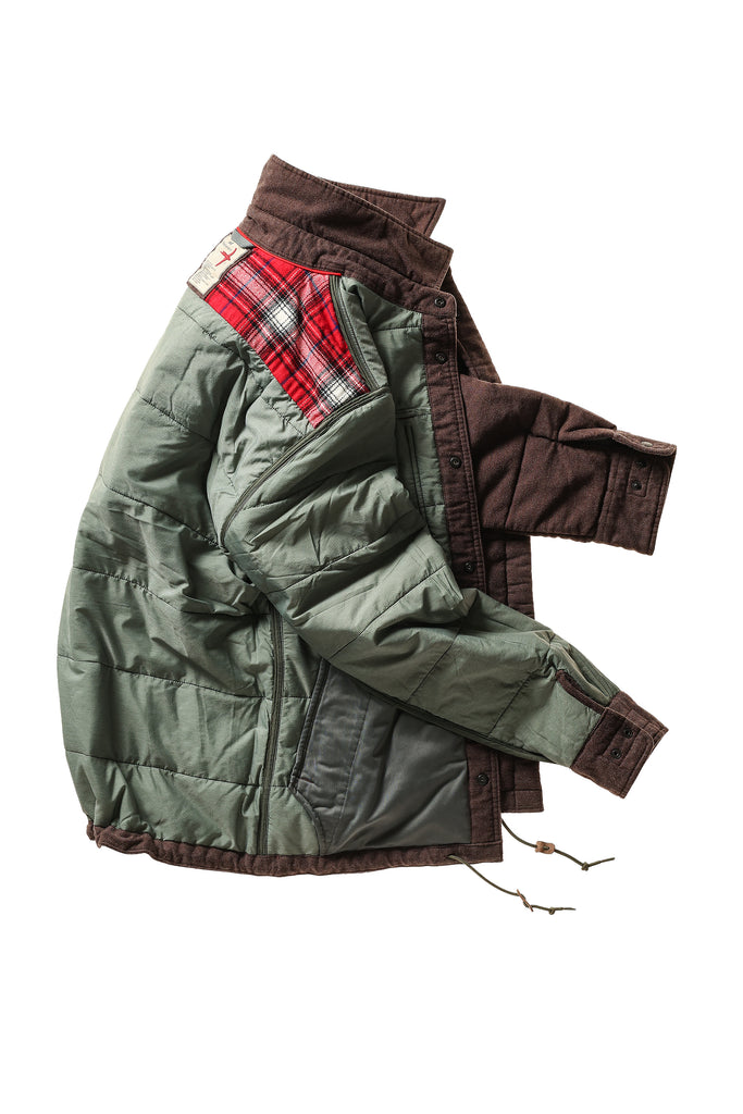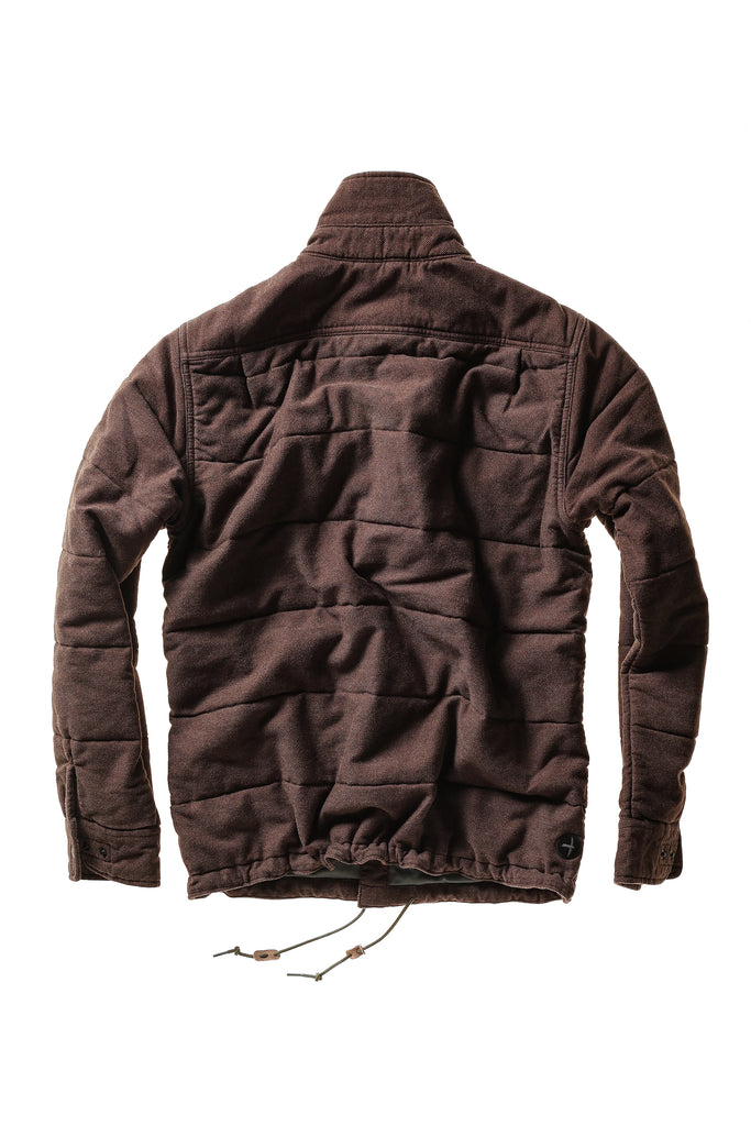 Relwen dark brown moleskin snap CPO jacket. The shell is 88% cotton, 12% polyester, cross-dyed moleskin twill, 257 gsm. The lining is cross-dyed nylon/poly shadow ripstop (pale olive) w/ 100% recycled polyester 80 gram fill. Interior yokeis 100% cotton, yarn-dyed plaid herringbone flannel.