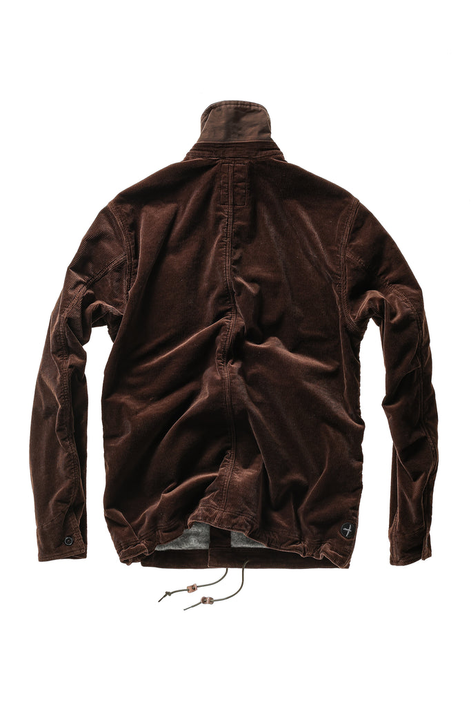 Relwen hickory brown corduroy pile lined chore coat. Fabric is 98% cotton, 2% stretch, mid-weight 13 wale corduroy, 320 gsm. With dyed-to-match canvas trim at backside of collar and half-moon facing, 310 gsm wih dyed-to-match 13 wale cord trim at collar facing. Lining is100% polyester knitted pile at body panels, with sleeves of quilted 100% poly ripstop. Dimensionalized hand pockets with soft brushed tricot interior facing and hidden zipper chest pocket.