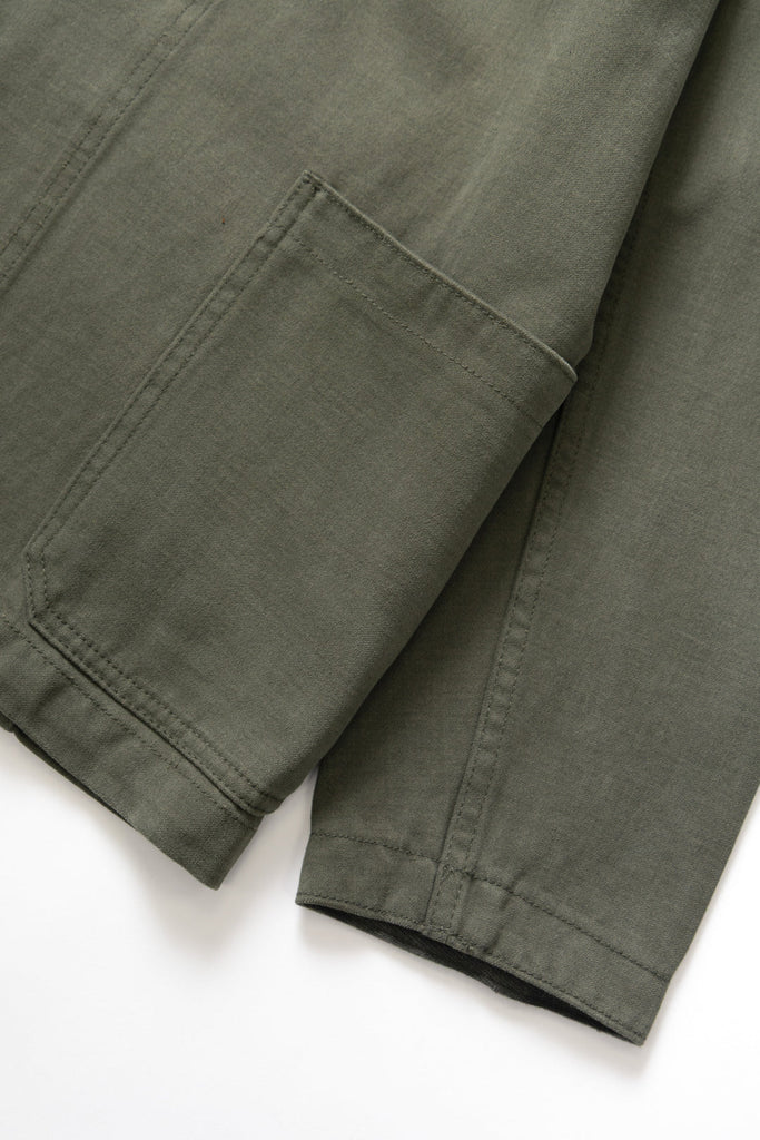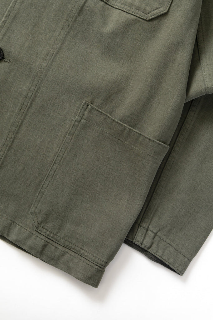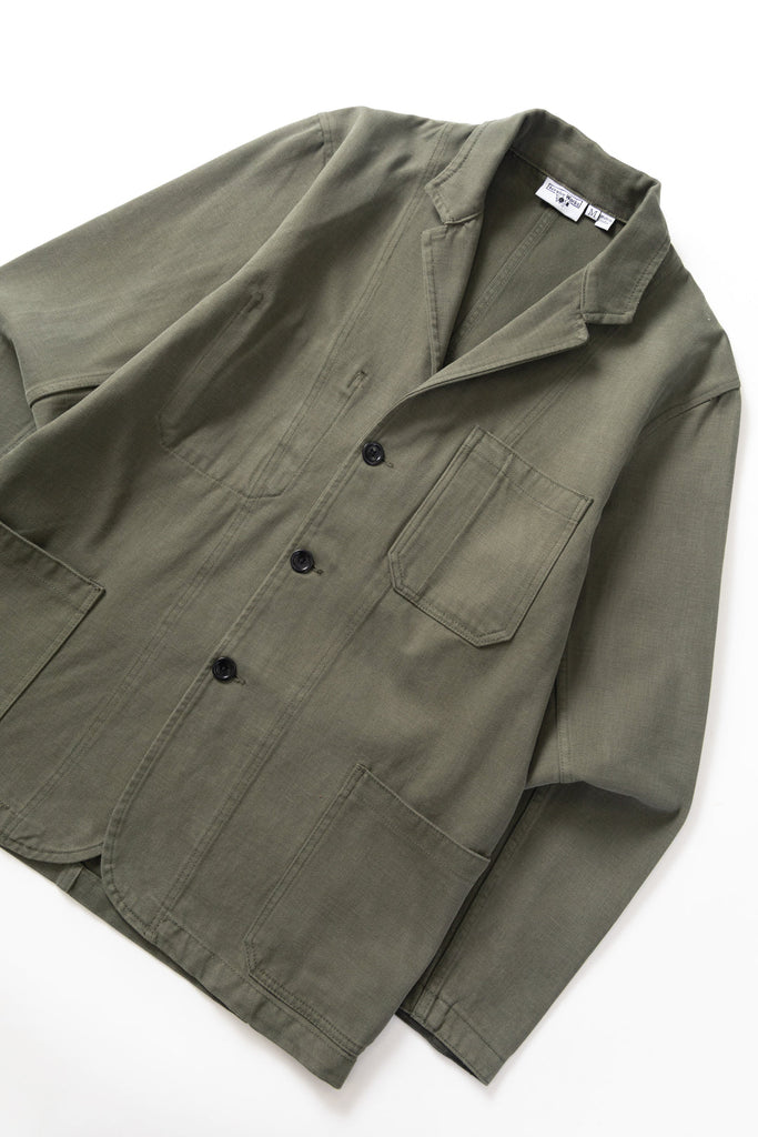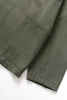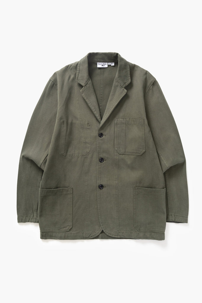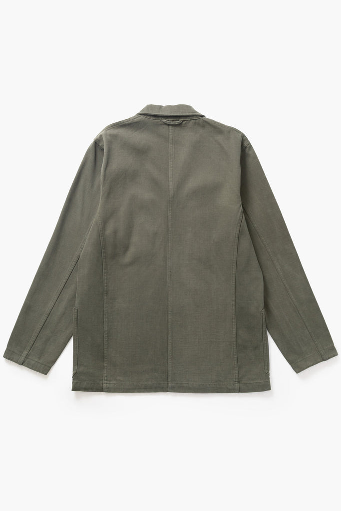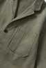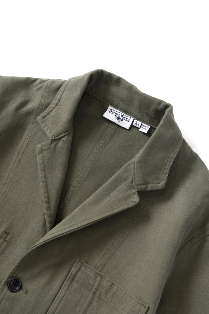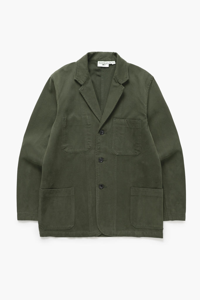 Service Works green moleskin server suit jacket. Regular fit, 3 button closure, exterior 3 pocket construction and one interior pocket. Constructed with GOTS certified 350GSM organic cotton moleskin.