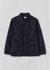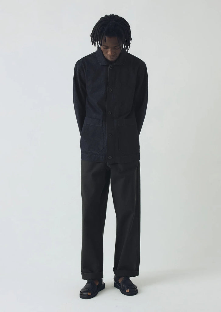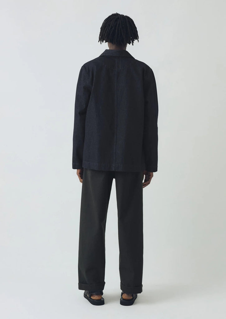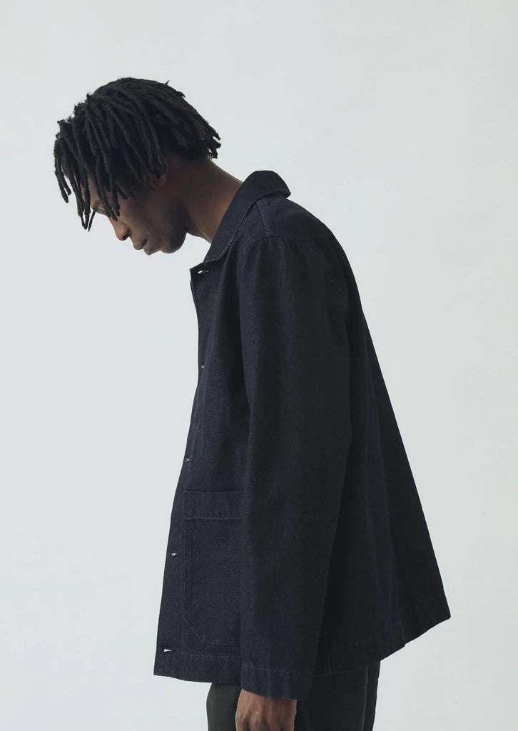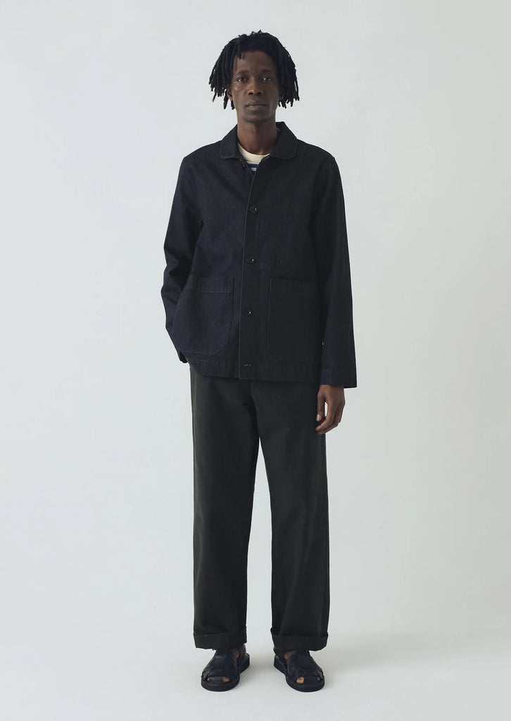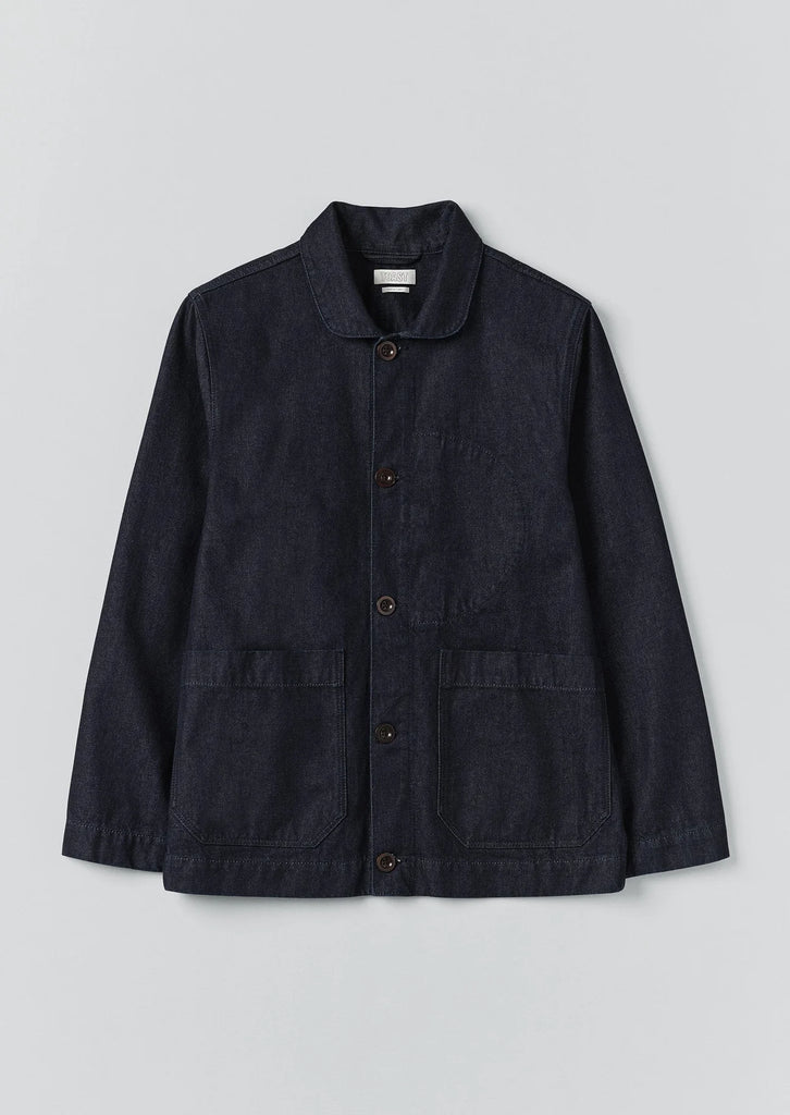 Toast indigo denim chore jacket. Made from a regenerative denim grown in Turkey. The jacket is cut to a straight shape, inspired by timeless workwear styles featuring classic utilitarian details such as a curved chest pocket. Finished with a subtly rounded collar and patch pockets.