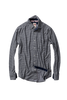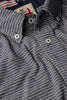 Relwen's midnight navy blue white striped 55% hemp 45% organic cotton button down long sleeve shirt. Yarn-dyed horizontal end on end stripe jersey (200 gsm ). Features classic 2 1/2" button down collar, natural mother of pearl shell buttons, single open patch pocket on chest, tapered waist for tailored fit. Single need clean finish construction.