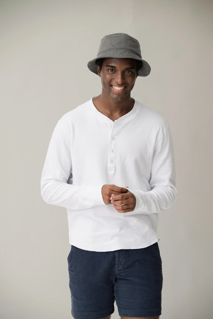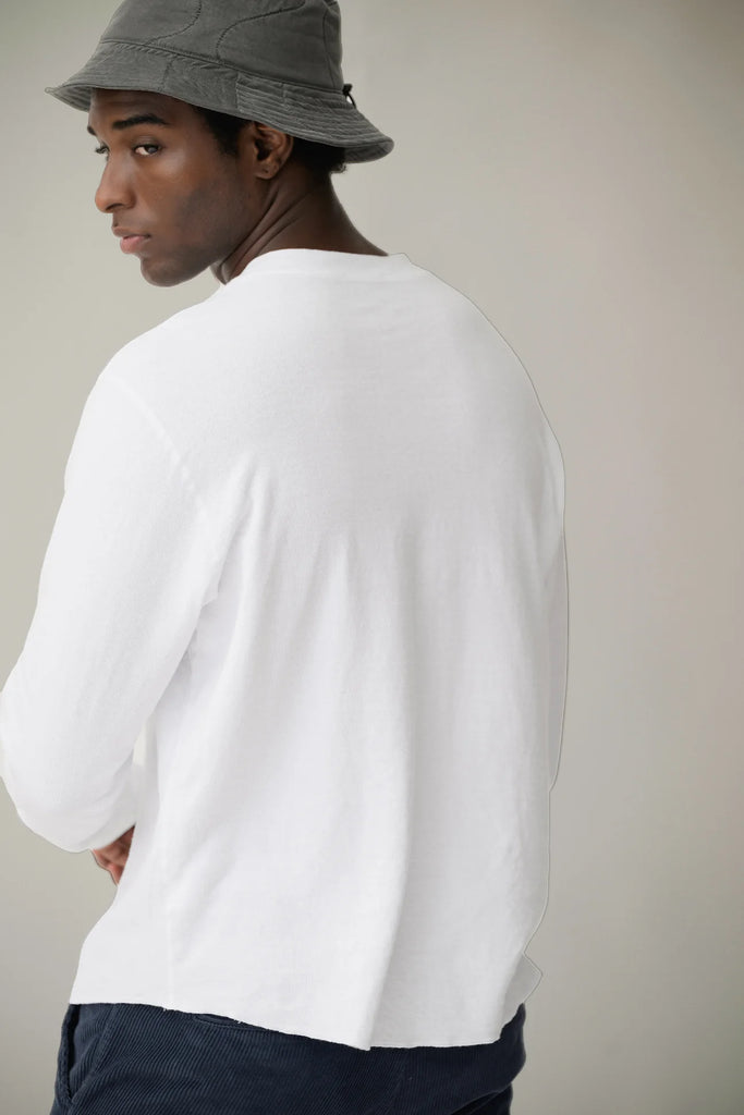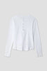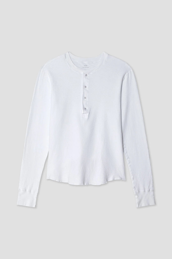 Save Khaki's white 100% cotton pointelle rib henley shirt. Features a self-placket with woven binding on the opening with 4 buttons, rib collar, rib cuff, woven binding and shirt tail hem with cover stitch finish.