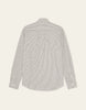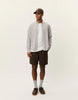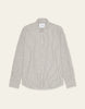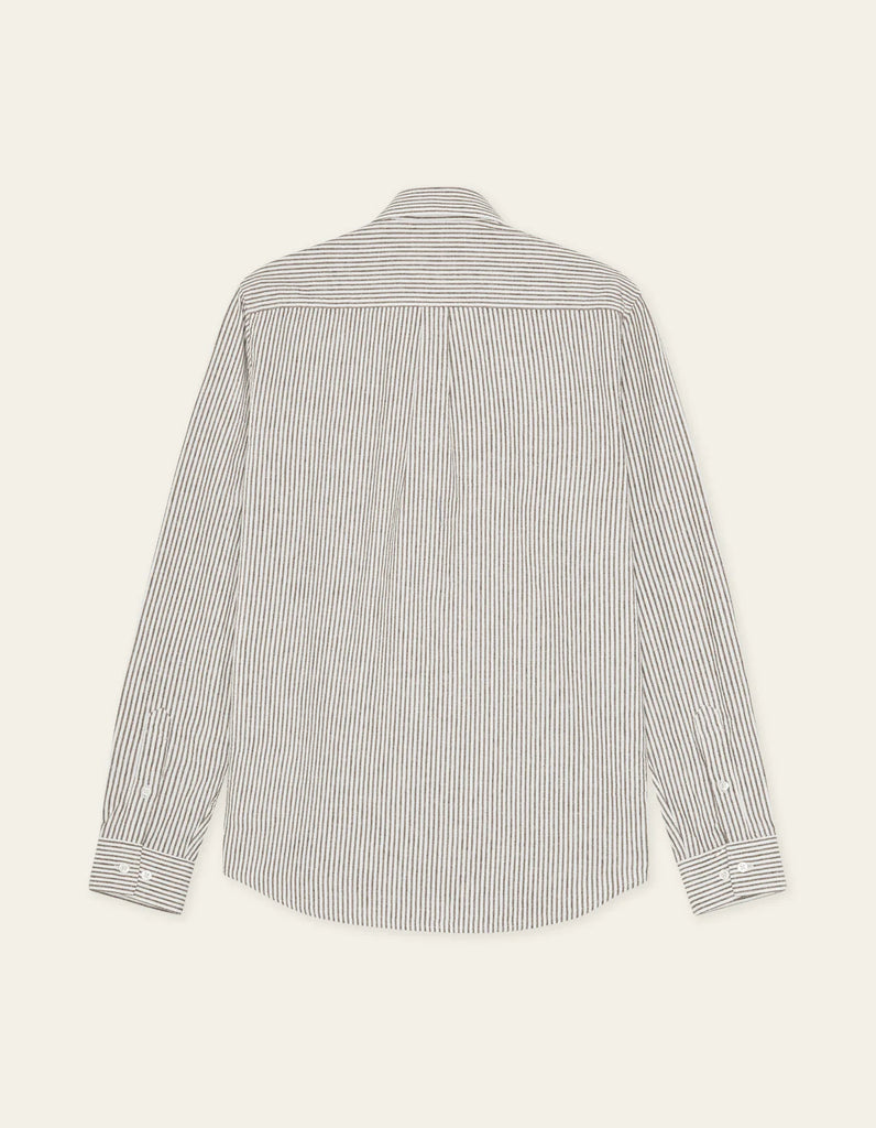 Les Deux Teak Brown Striped Konrad Cotton Linen Oxford Shirt. Features a button-down collar, tonal chest embroidery, and traditional shirting construction. Made of 70% Cotton and 30% Linen lightweight fabric, box pleat yoke on back, button cuffs, curved back hem and fitted