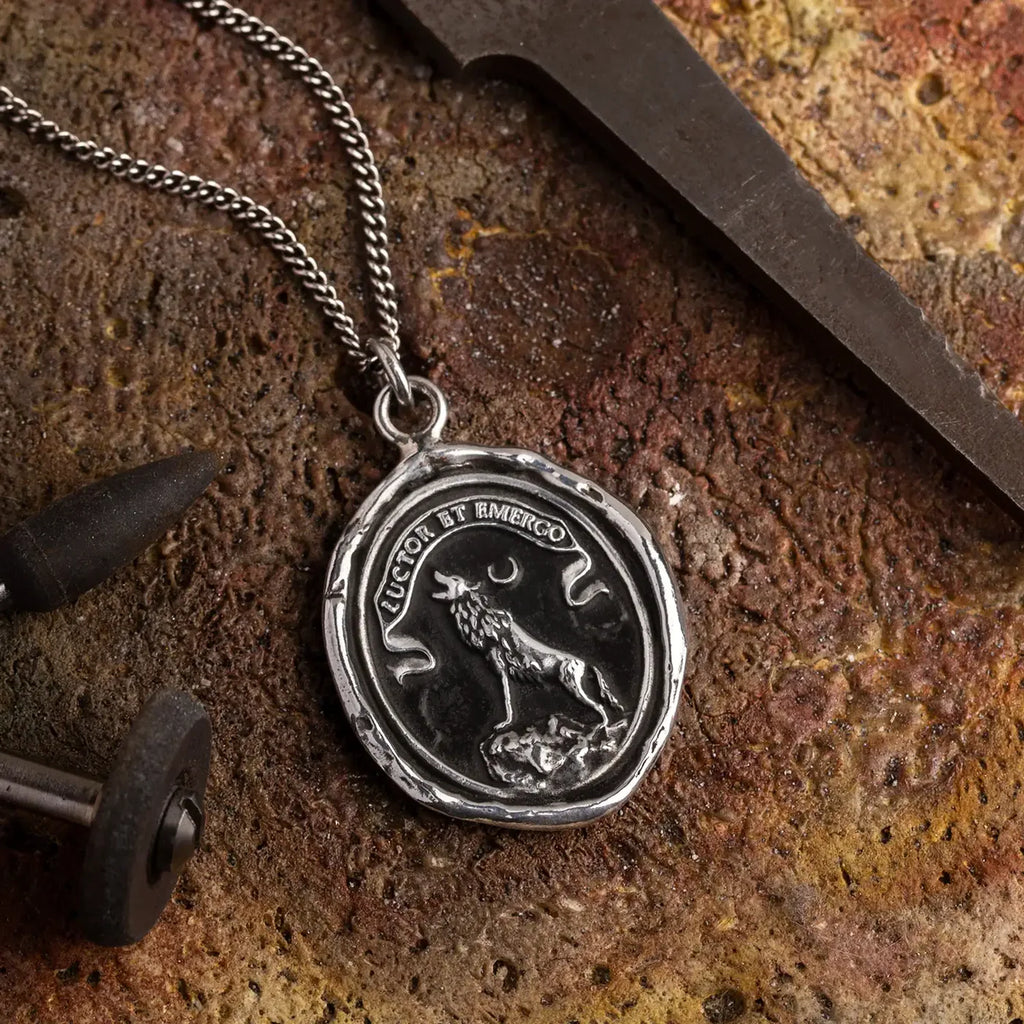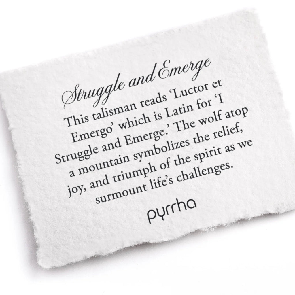 Talisman reads 'Luctor et Emergo' which is Latin for 'I Struggle and Emerge.' The wolf atop a mountain symbolizes the relief, joy, and triumph of the spirit as we surmount life's challenges.