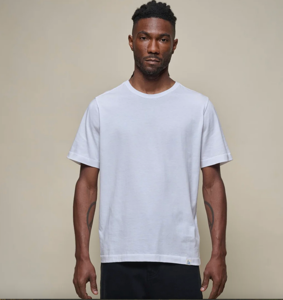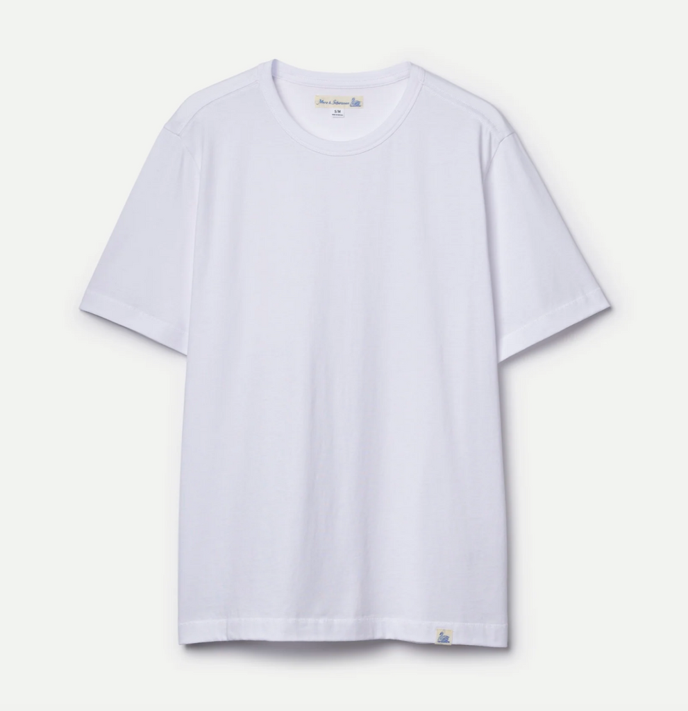 Merz b. Schwanen white relaxed-fit, 100% organic light jersey Pima cotton crewneck tee. Lightweight and breathable. Triangle inserts under arms. Baseball stitching, swan loop label on hem. 140g/sqm | 4,1oz/sq. yard. Made in Portugal.