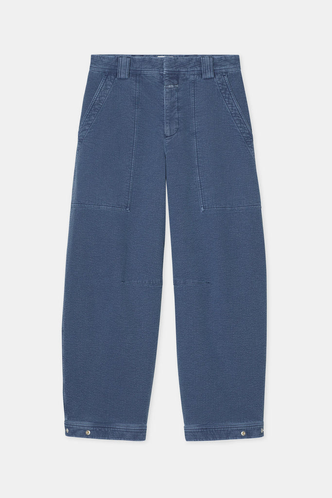 Closed Eclipse Rhannon barrel fit jeans, featuring a mid-waist, cropped leg silhouette. They come with wide belt loops and large workwear-inspired pockets on the front and back. Special waistband and an adjustable hem with Closed metal buttons complete the design.