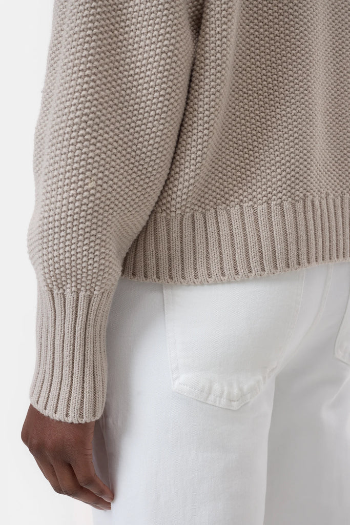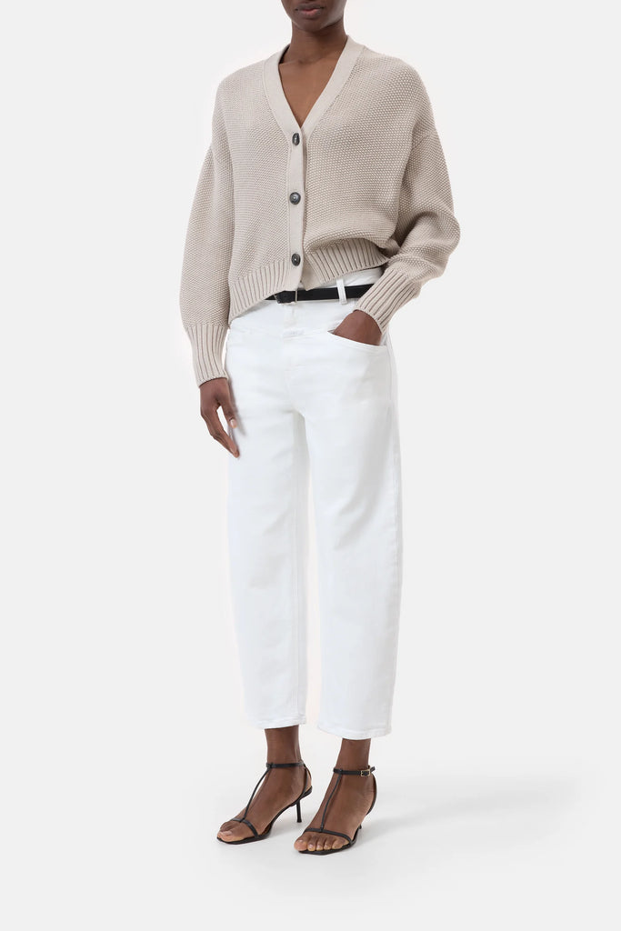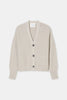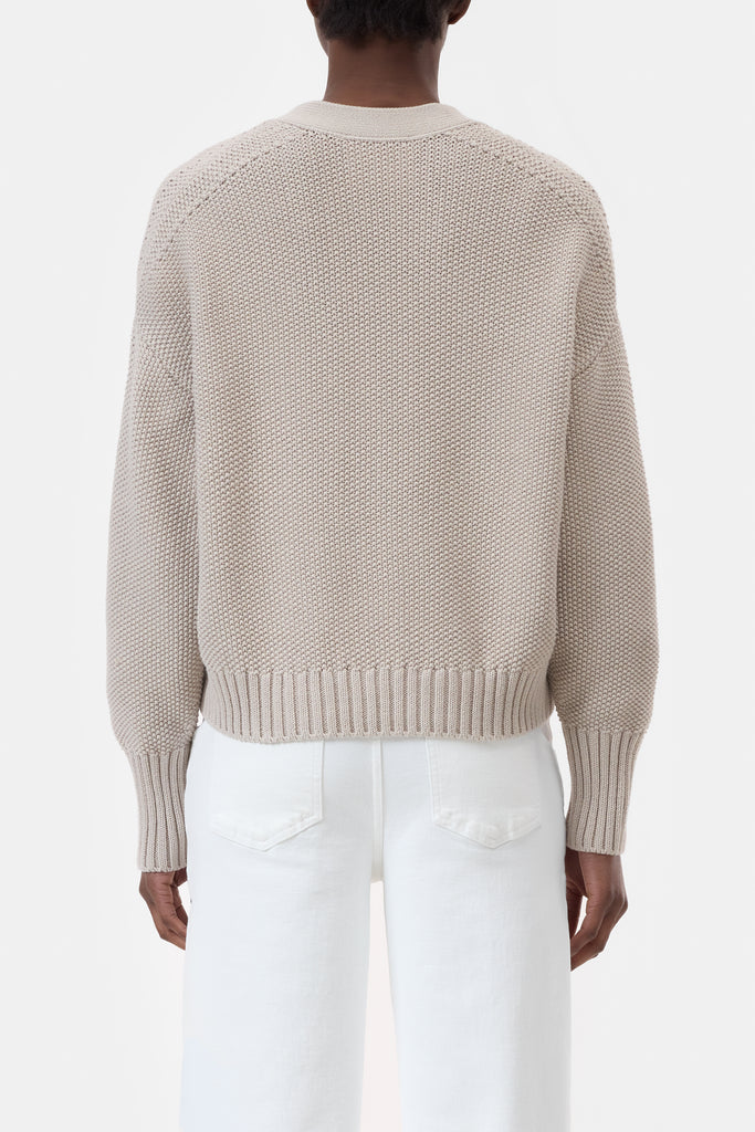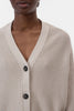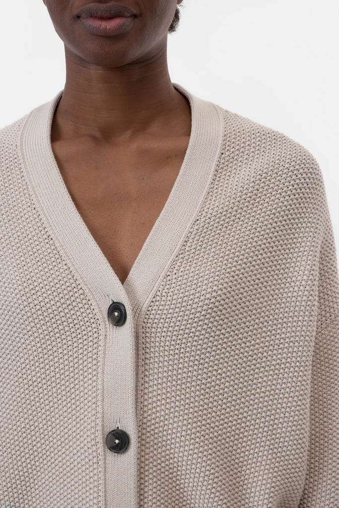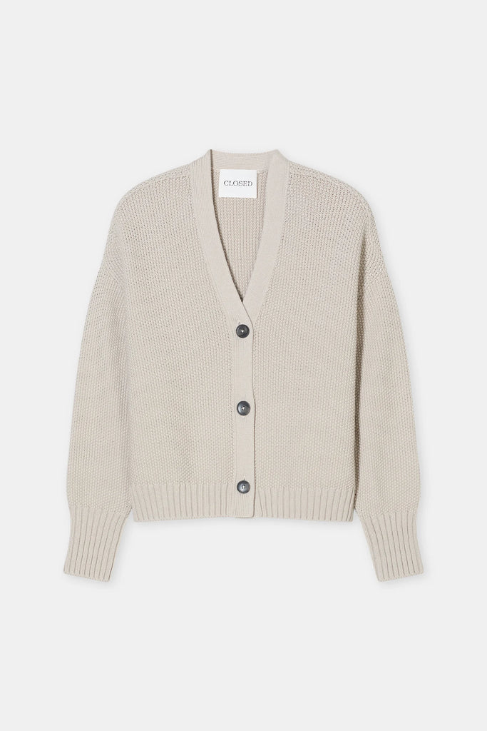 Closed beige 100% organic cotton cardigan sweater. Regular fit. Straight fit with a V-neckline and wide ribbed cuffs at the sleeve ends and hem. The buttons have a horn look.Knitted cardigan (5 gg) has a medium-weight waffle texture and is made from a yarn made from high-quality organic cotton.