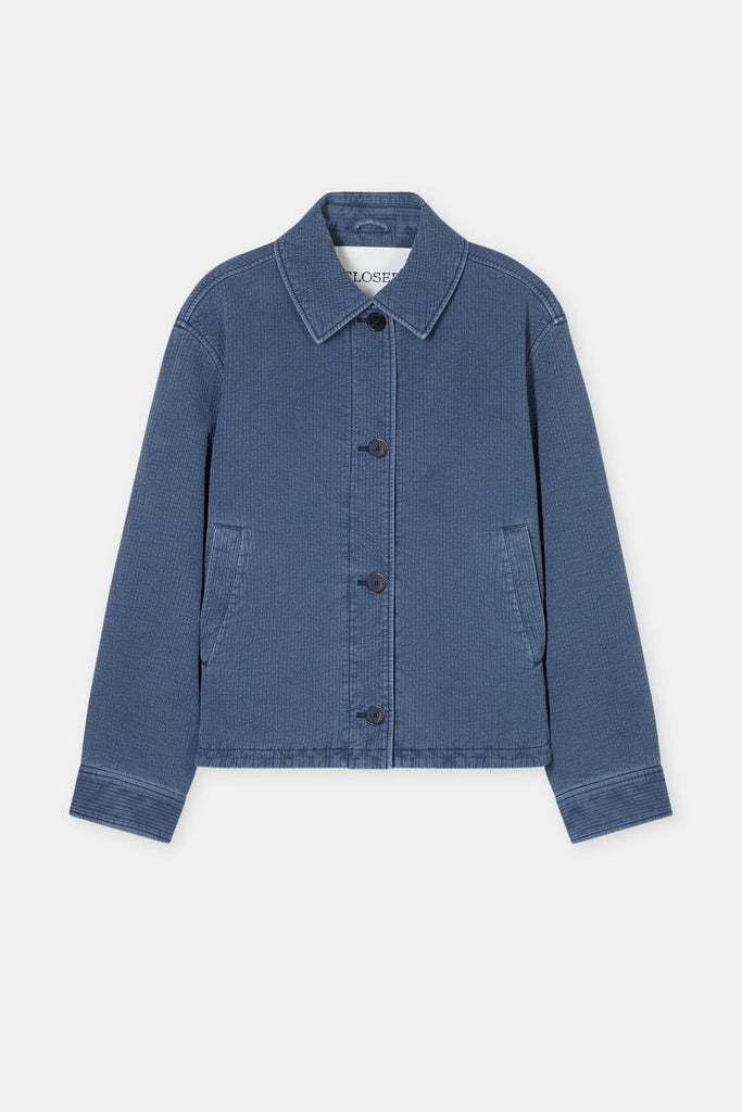 Closed Women's A-Line Jacket has a relaxed fit and modern cropped cut. Made from premium double-layer cotton with distressed details and special surface structure, it features welt pockets and a curved hem. Made in Romania.