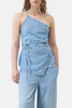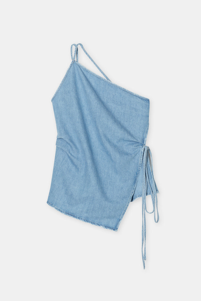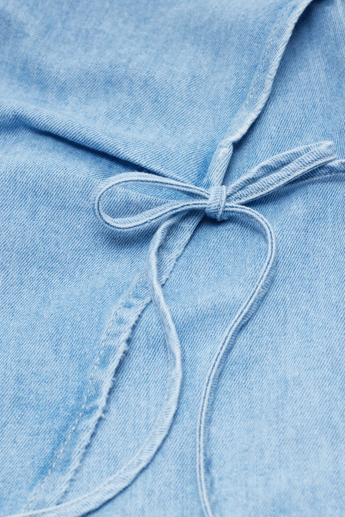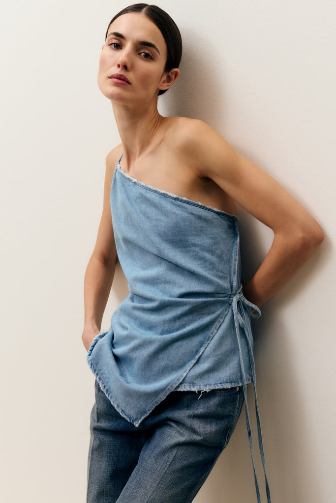 Closed light blue cotton denim wrap shirt. Slim fit. Lightweight Italian rigid denim (8.5 oz.) with authentic worn effects, our asymmetric wrap top is made in Portugal. This slim-fit top is secured at the waist with a wrap detail.