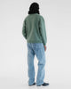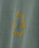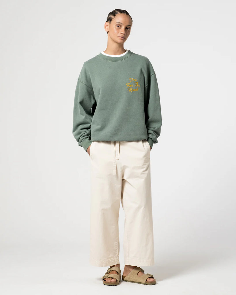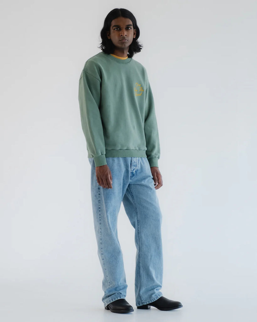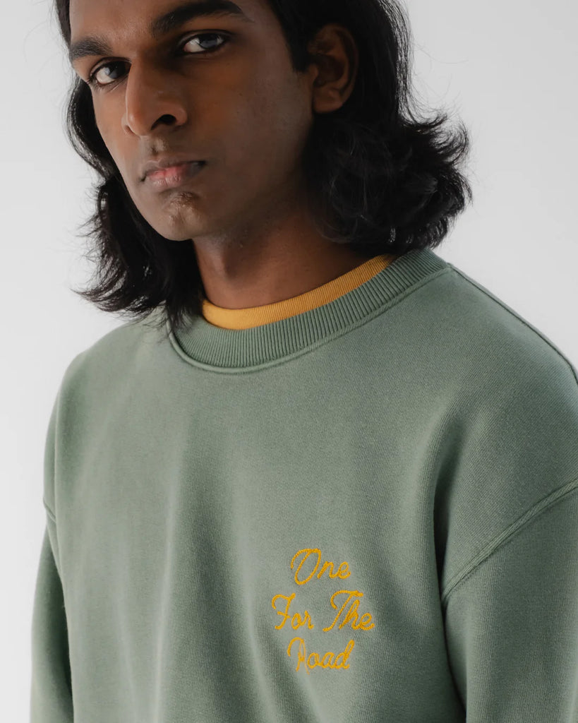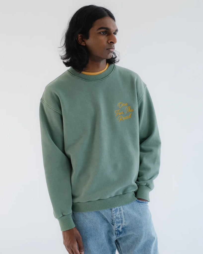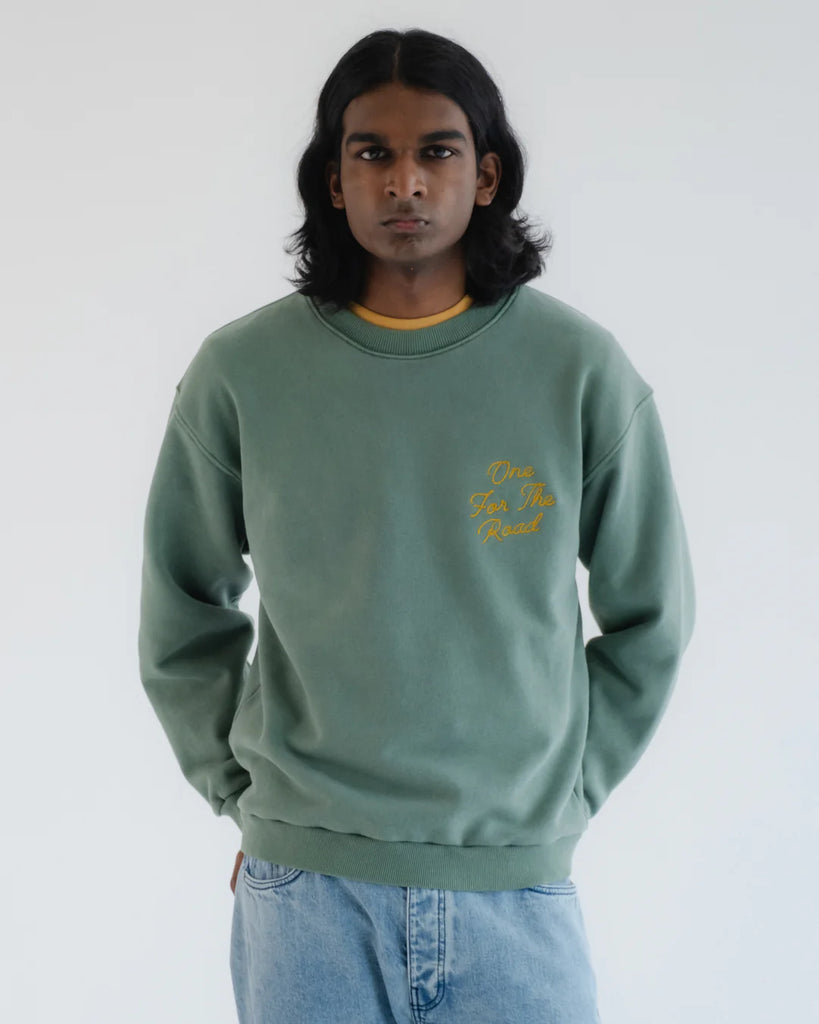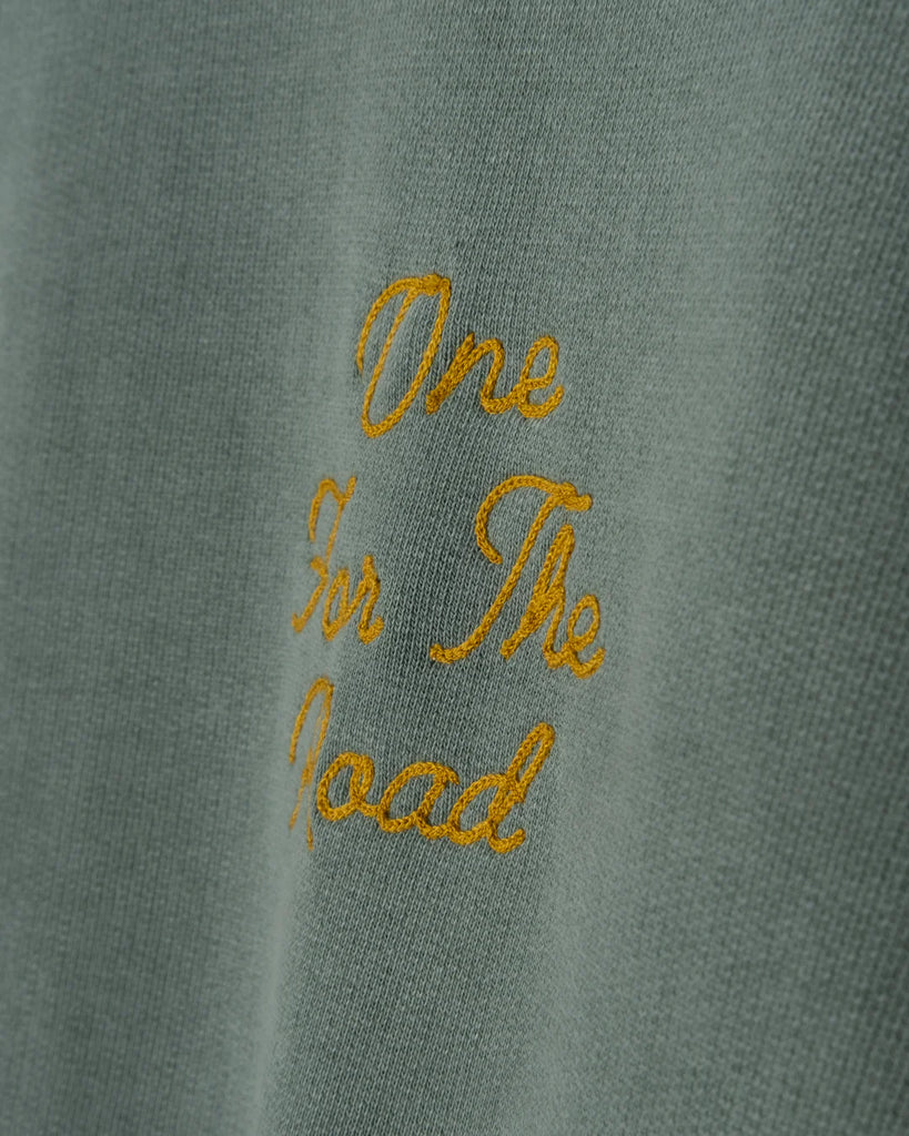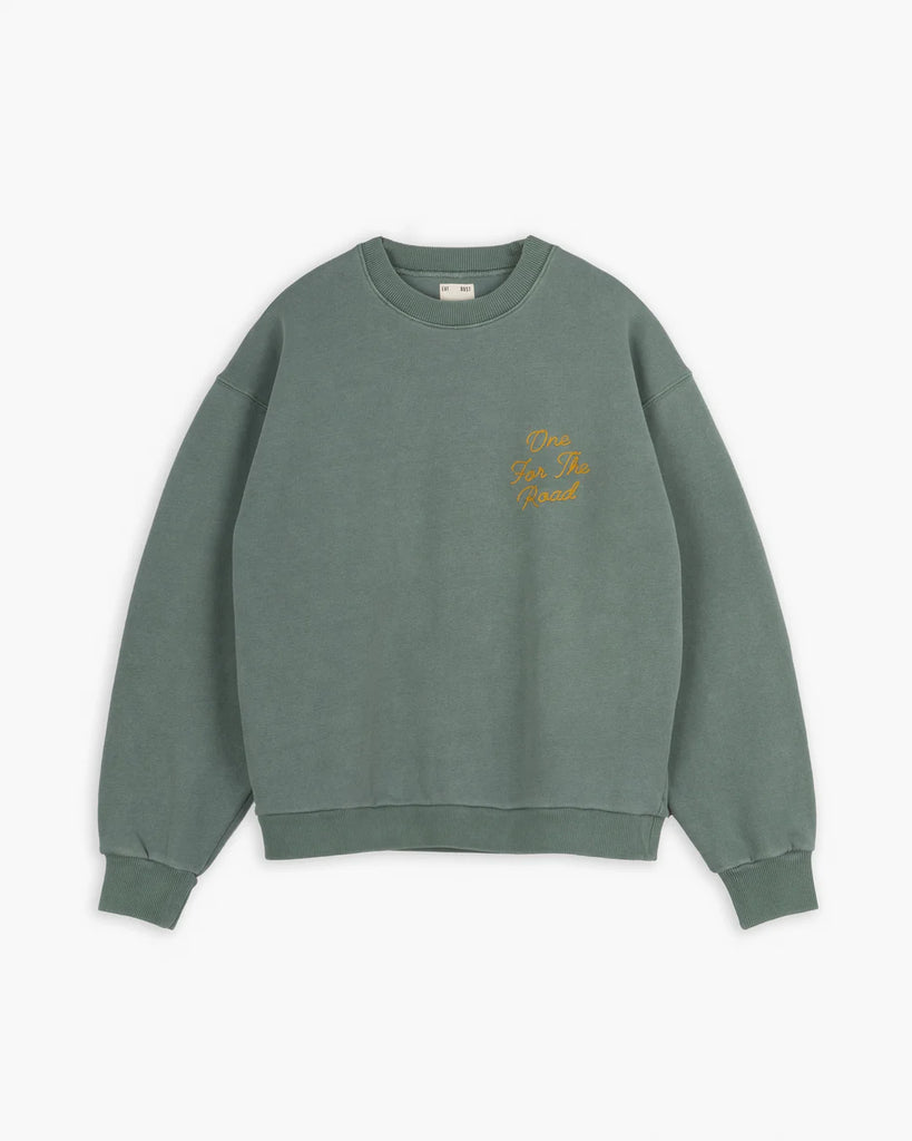 Eat Dust juniper green 100% cotton Detriot sweatshirt. Featured "One for the Road" embroidered on chest. Unisex basic boxy design features ribbed trim cuffs, collar and hem for a snug fit. Pigment vintage washed.