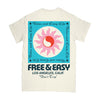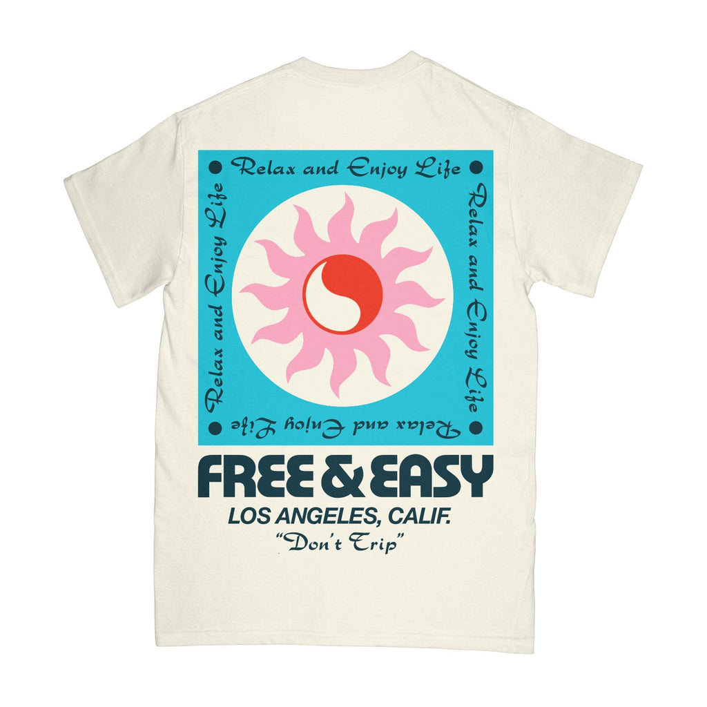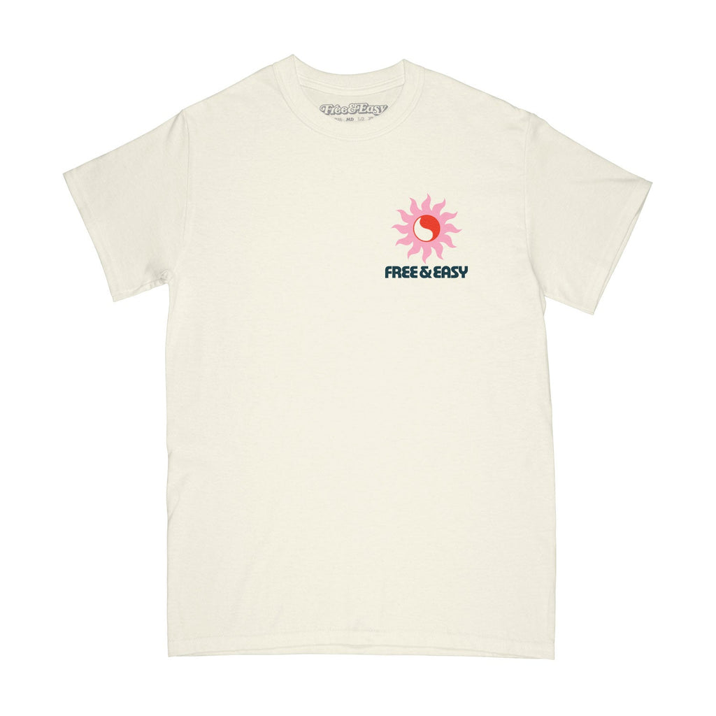 Free and Easy vanilla tee. 100% cotton in vanilla off white with a pink yin yang sun on front and back. Free & Easy logo on chest. Made with hand-screened graphics in Los Angeles.