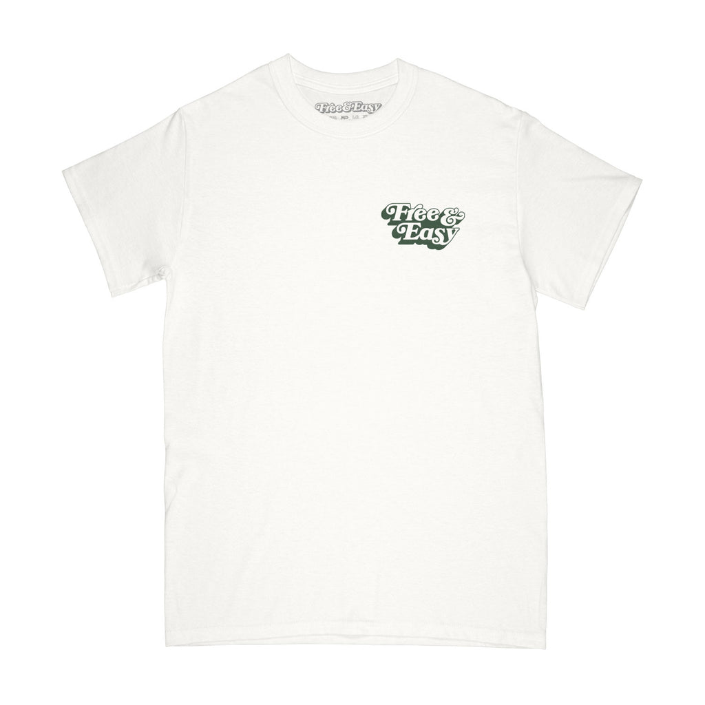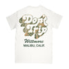 EXCLUSIVE! Free and Easy Don't Trip Malibu drop shadow tee in a coconut color tee with Realfree camo print drop shadow and dark green ink. 100% cotton. Don't Trip logo on back. Free & Easy x Wittmore logo on chest. Made with hand-screened graphics in Los Angeles.