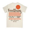 Free and Easy natural tee. 100% cotton in natural with orange Don't Trip graphic on front and back. Free & Easy logo on chest. Made with hand-screened graphics in Los Angeles.