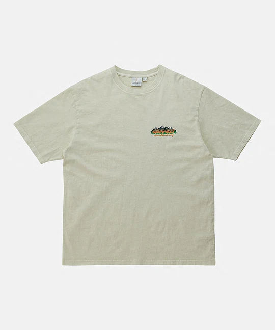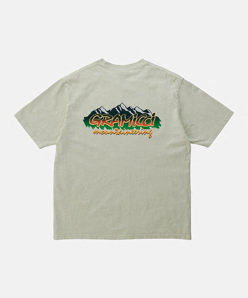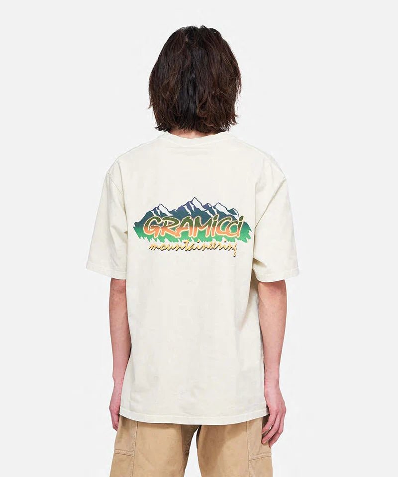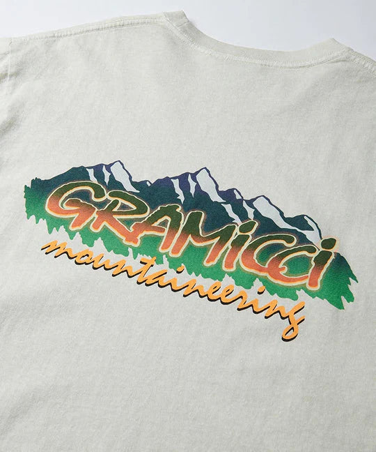 Gramicci natural Mountaineering graphic t-shirt has a relaxed fit and features mountain graphic on back and front chest. It is made of organic cotton mid weight jersey. Imported.
