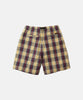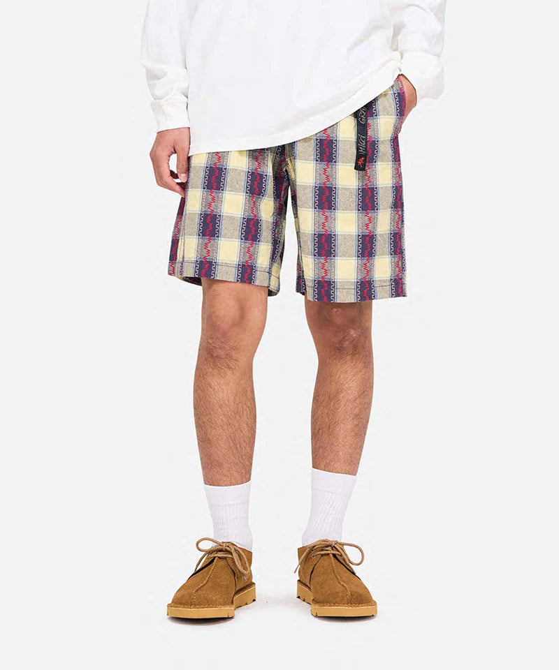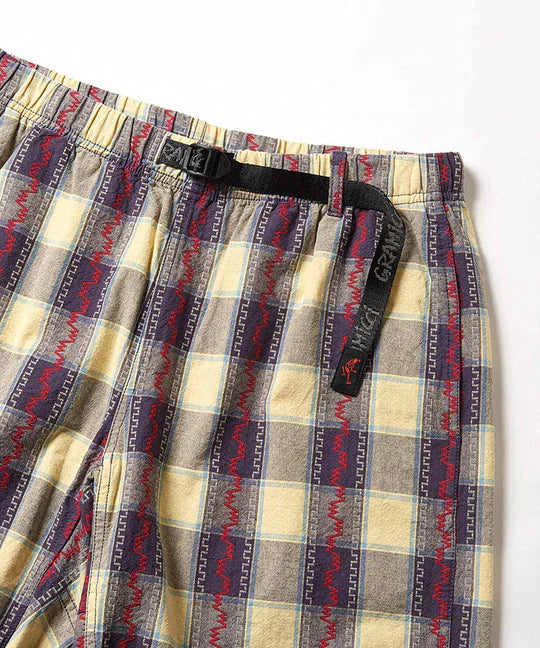 Gramicci yellow multi eco cotton in a head-turning tribal check pattern fabric G Short features an elastic waistband and a nylon cinch belt.  It has a relaxed fit and sits at the waist and features lock stitching and a 9" inseam. and deep front pockets, and Velcro-tabbed rear pockets.