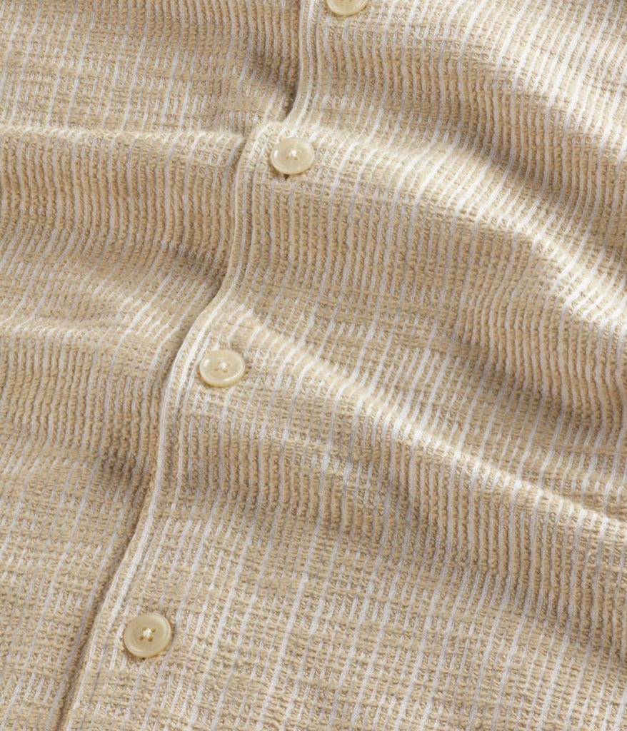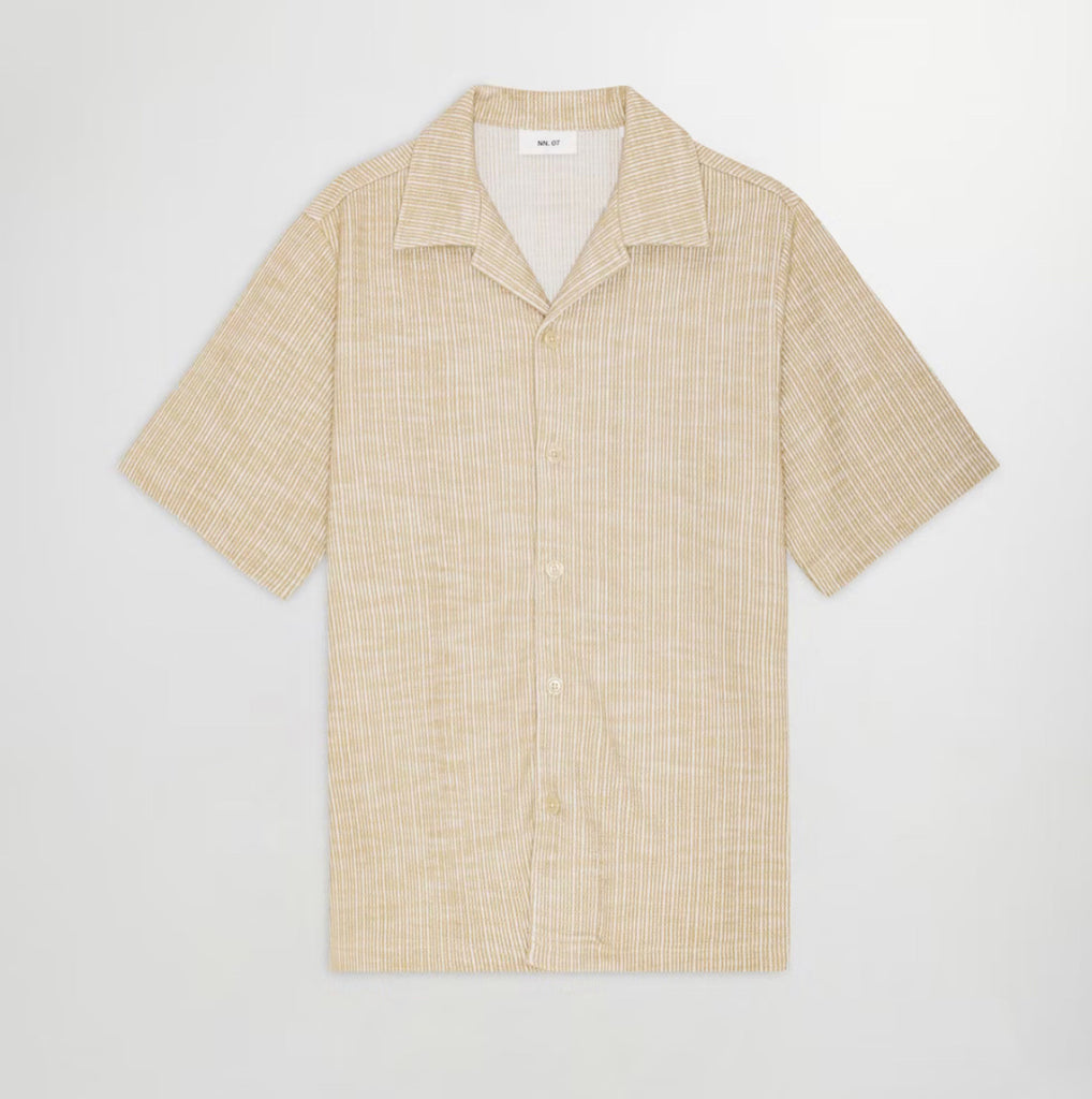 NN.07 White Pepper Boucle Yarn short sleeve Julio shirt. Fabric is a soft drapey 59% recycled polyester and 29% cotton blend in an all-over bouclé jacquard designed with an open collar and features mother of pearl buttons