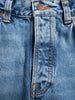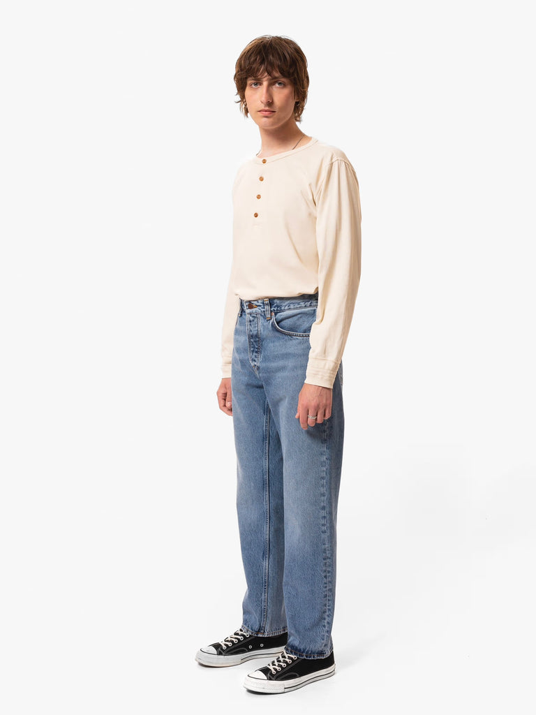 Nudie Jeans indigo blues wash 5 pocket rad rusfus style jeans. A high-waist regular fit with a straight leg in a vintage-like mid-blue wash. Made from organic cotton.