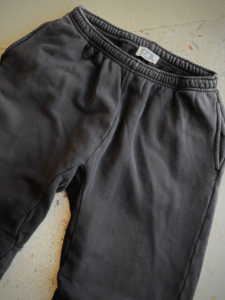 Velva Sheen 8 oz midweight new gym sweatpants in pigment dyed in black. 100% french terry cotton with a soft french terry looped interior for softness. Drawstring elastic waist, side pockets,  no back pocket and gusted crotch for movement.